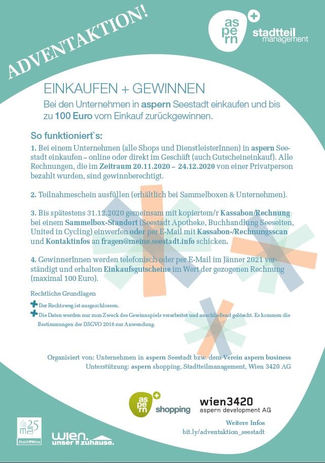 Die Adventaktion in der Seestadt macht Ihre Weihnachtseinkäufe noch beSINNlicher: Gemeinsam sagen wir der Corona-Krise den Kampf an.Das Beste daran: Sie müssen nichts anderes tun, als Ihre Weihnachtseinkäufe regional in aspern Seestadt zu erledigen und an unserer Adventaktion teilzunehmen. So können Sie Ihren Einkauf im Wert von maximal 100 Euro in Form von Seestadt-Einkaufsgutscheinen zurückgewinnen.Wie können Sie teilnehmen?Bei einem Unternehmen (alle Shops, Lokale und DienstleisterInnen) in aspern Seestadt einkaufen – online oder direkt im Geschäft – gerne auch Gutscheine! Alle Rechnungen, die im Zeitraum 20.11.2020 – 24.12.2020 von einer Privatperson bezahlt wurden, sind gewinnberechtigt.Teilnahmeschein ausfüllen. Diese sind erhältlich bei den Sammelboxen-Standorten (Seestadt Apotheke, Buchhandlung Seeseiten, United in Cycling) & Unternehmen.Bis spätestens 31.12.2020 gemeinsam mit kopiertem/r Kassabon/Rechnung bei einem Sammelbox-Standort einwerfen oder per E-Mail mit Scan von Kassabon/Rechnung und Kontaktinfos an fragen@meine.seestadt.info schicken.Die GewinnerInnen werden telefonisch oder per E-Mail im Jänner 2021 verständigt und erhalten Einkaufsgutscheine aus der Seestadt im Wert der gezogenen Rechnung oder maximal 100 Euro.Wir wünschen ein frohes und besinnliches Shoppen!Die Adventaktion wird organisiert von den Unternehmen in aspern Seestadt bzw. dem Verein aspern business, mit der Unterstützung von aspern shopping, Stadtteilmanagement und Wien 3420 aspern Development AG. Rechtliche GrundlagenDer Rechtsweg ist ausgeschlossenDie Daten werden nur zum Zweck des Gewinnspiels verarbeitet und dann gelöscht. Es kommen die Bestimmungen der DSGVO 2016 zur Anwendung.
