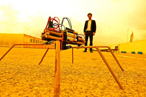 Der Medienkünstler und Robotikfachmann Erkin Bayirli versucht vor Ort, einem Roboter aus Bambus Bewegungsimpulse zu impfen.