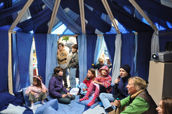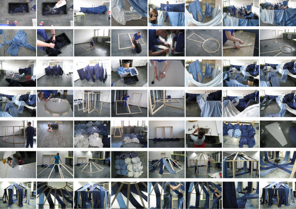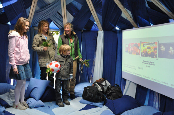 Pia Scharler, Hanna Moosbauer und Mario Gamser, drei Studenten der Universität für Angewandte Kunst, stellen auf dem Areal von aspern Die Seestadt Wiens ein Karaoke-Zelt auf.