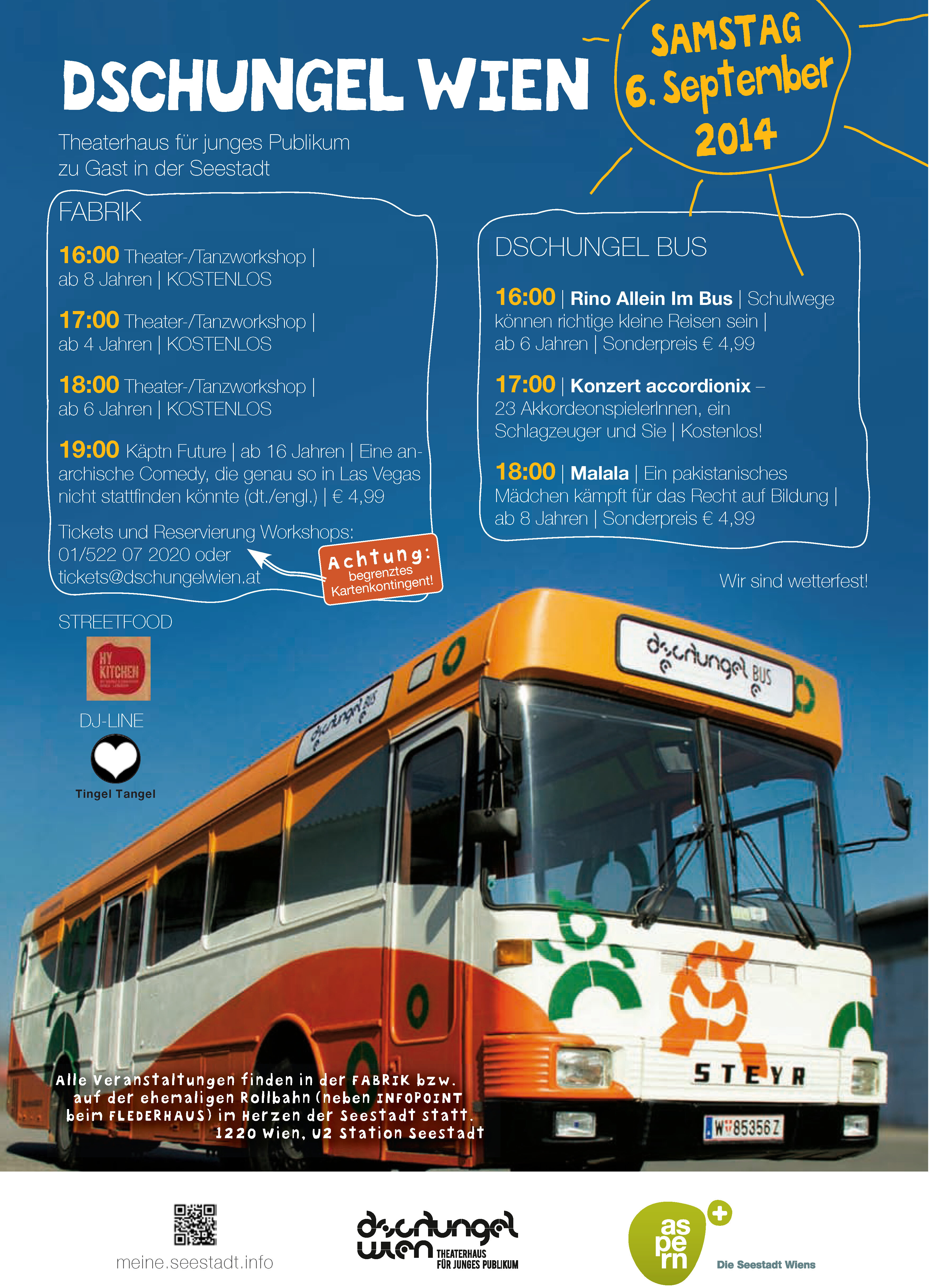 Am Samstag, 6. September 2014 ab 16:00 Uhr heißt es „Bühne frei“ für die SchauspielerInnen, MusikerInnen und WorkshopleiterInnen des DSCHUNGEL WIEN. Drei Theaterstücke, drei kostenlose Workshops, ein Konzert sowie musikalische Nachmittagsuntermalung durch das DJ-Kollektiv TingelTangel stehen auf dem Programm. ‚Good Streetfood‘ liefert das Hy Kitchen Mobil.