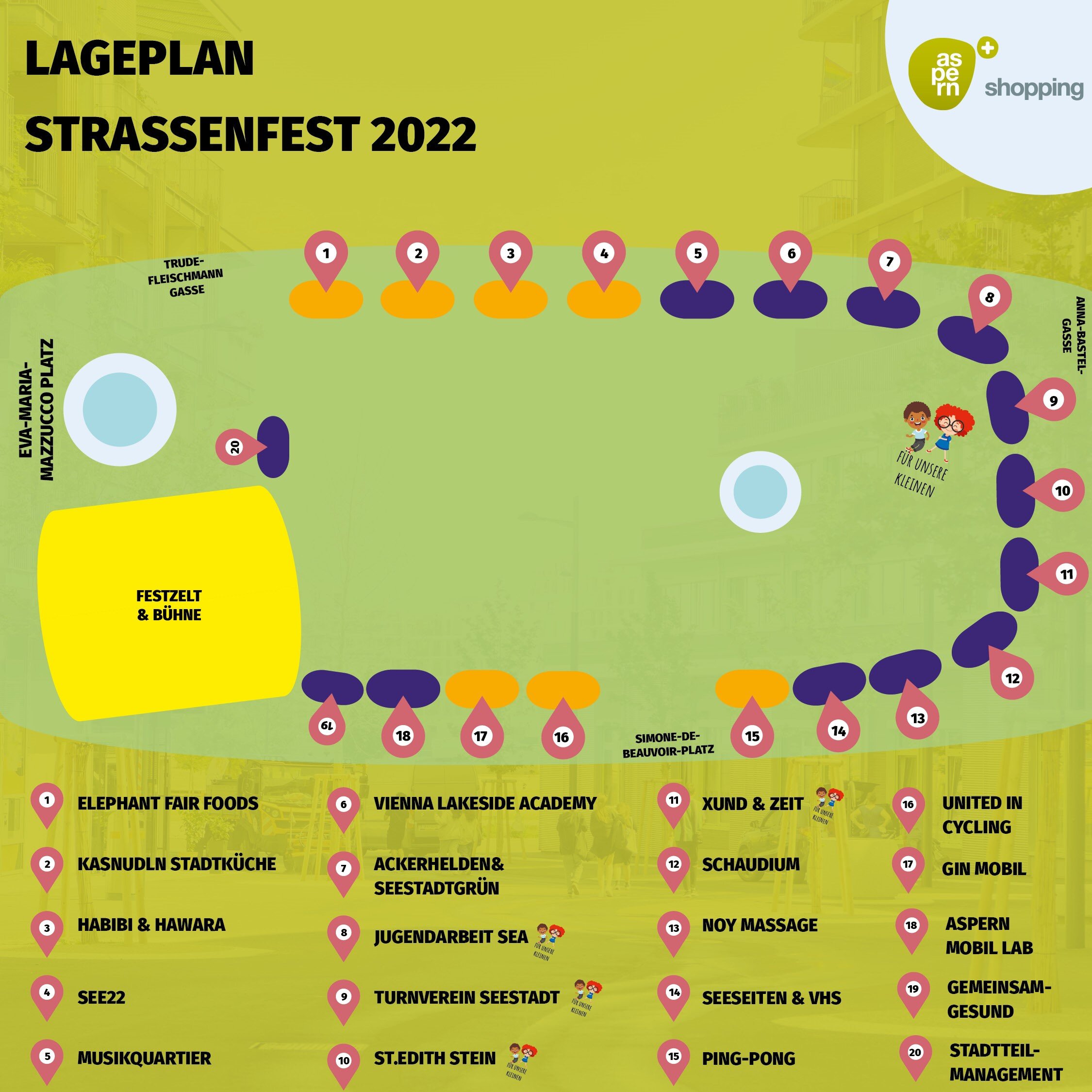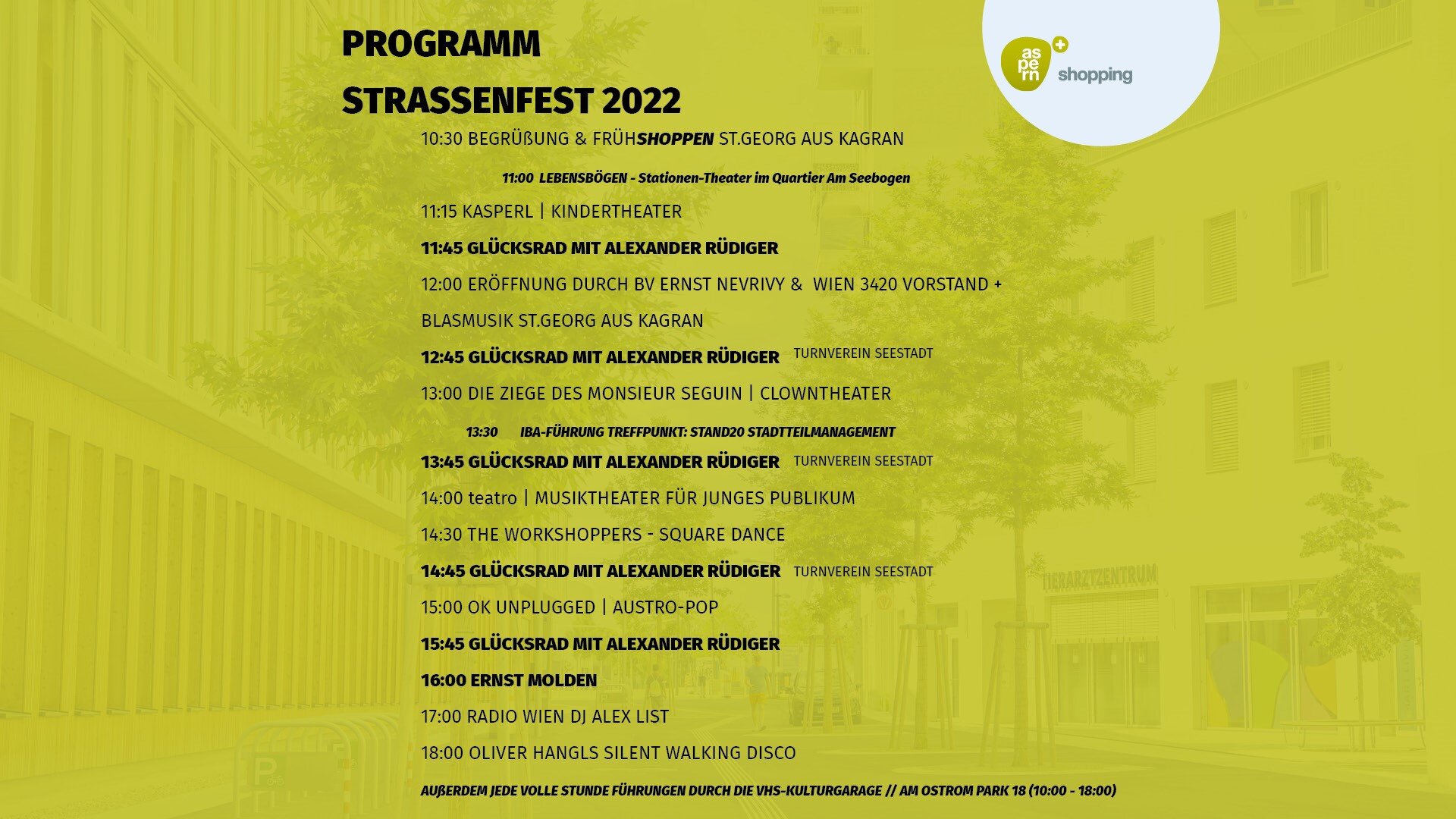 Zum siebenten Mal aber erstmals am Eva-Maria-Mazzucco-Platz im Seeparkquartier, präsentiert sich heuer das Seestädter Straßenfest mit buntem Unterhaltungsprogramm.Schmankerl, Schmäh und Shopping-SpaßAuf der Festbühne laden Seestädter Shops, Unternehmer*innen, Lokale und Initiativen zum „Strandeln an Standeln“, Genießen und Kennenlernen ein. Das Programm wird vielfältig und ist jedenfalls für Groß und Klein.Wann? Samstag, 3. September 2022 (bei jedem Wetter) von 10-18 Uhr (+ After-Party am See) Wo? Eva-Maria-Mazzucco-Platz / SeeparkquartierProgramm auf der Festbühne 10:30: Frühshoppen mit der Blasmusik St. Georg Kagran11:15: Wiener Prater Kasperl-Theater12:00: Offizielle Eröffnung, im Anschluss Blasmusik, Money Maker Alexander Rüdiger dreht das Glücksrad12:45: Kunterbuntes Clownstheater13:00: „Die Ziege des Monsieur Seguin“: Kindertheater vom Club Der Kleinen Löwen13:30: Start der IBA-Führung durch die Seestadt, bzw. zum IBA-Standort14:00: „Bambi-Musical/ Die Geggis“ mit Teatro 14:30: Square Dance Workshop mit Thomas Blaschke15:00: Austro-Pop mit OK Unplugged16:00: Auftritt Ernst Molden17:00 Radio Wien DJ-Set mit Alex List18:00 Start von Oliver Hangls Silent Walking DiscoAußerdem: 11:45 13:45, 14:45 & 15:45: Money Maker Alexander Rüdiger am Glücksrad und verlost tolle Preise Seestädter Unternehmen 12:55, 13:55 & 14:55: Akrobatik vom Turnverein Seestadt10:00 bis 18:00: Jede Stunde eine exklusive Führung durch die VHS Kulturgarageund ein Überraschungsauftritt des Theater 7 mit den „Lebensbögen“Darüber hinaus können sich alle Besucher*innen auch noch auf Allerlei sportliche, kreative, kulinarische und nachbarschaftliche Besonderheiten freuen. Welche das genau sind, das erfahren Sie in Kürze.Streichen Sie sich den 03. September also in ihrem Kalender an und halten Sie sich am Laufenden! Weitere Infos folgen auch in unserem Facebook-Event!
