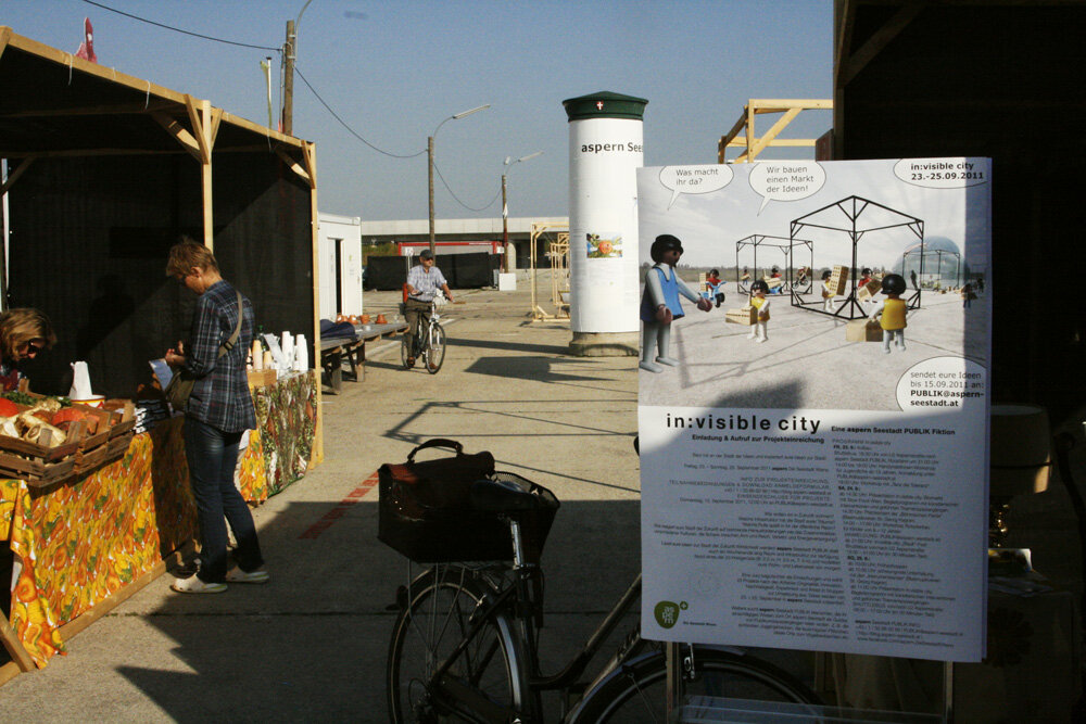 Von Freitag, 23. September bis Sonntag, 25. September 2011 fand in aspern Seestadt PUBLIK in:visible:city statt. In Holzquadern und am Gelände des ehemaligen Flugfeldes präsentierten TeilnehmerInnen ihre Visionen von der Stadt der Zukunft. Das in:visible city Wochenende wurde umrahmt von Blasmusik, Biomarkt mit regionalen Produkten, realen und virtuellen Führungen, Frühschoppen, Workshops für Kinder, Jugendliche und TänzerInnen. Hier ein kurzer Rückblick: