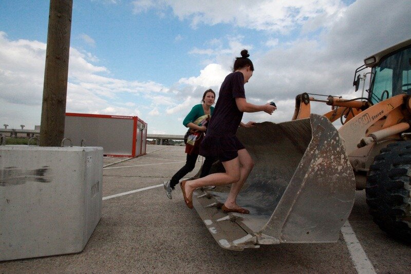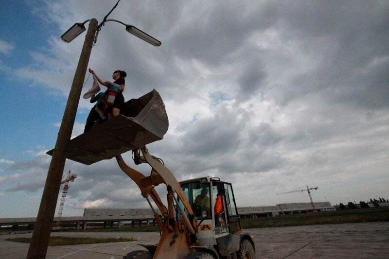 Himmelsstürmend bestiegen die kumpaninnen furchtlos Baggerschaufeln, die sie in entsprechende Höhen zu den Lichtmasten emporhoben, um die Flaggen anzubringen und dem Wind zu übergeben.