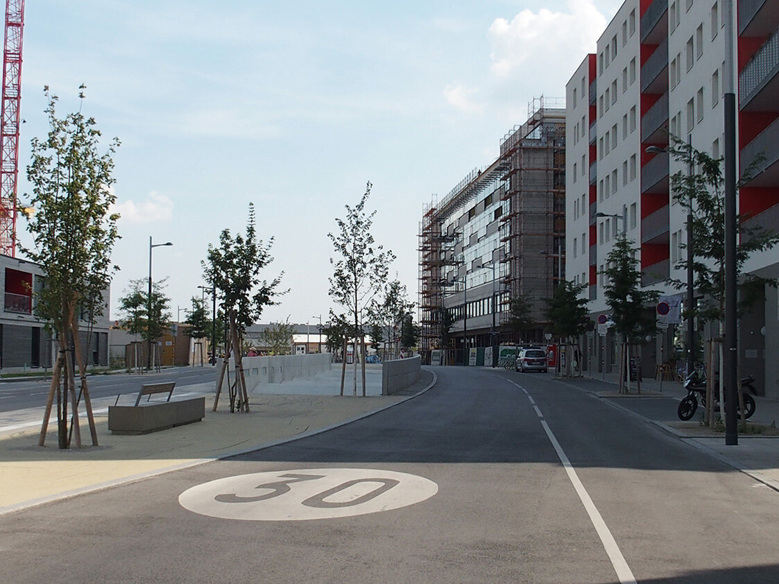 Die Seestadt setzt auf das Schwammstadt-Prinzip: Entlang der Straßen und Wege im Norden des Stadtteils fangen unterirdische Speicher Regenwasser auf. Das reduziert bei Starkregen Überflutungen, versorgt Bäume mit Wasser und schafft so ein angenehmes Mikroklima – ein nachhaltiger Beitrag zu einem lebenswerten Stadtteil. Regengärten in den Parks sorgen zusätzlich dafür, dass kostbares Regenwasser versickert, statt im Kanal zu verschwinden.