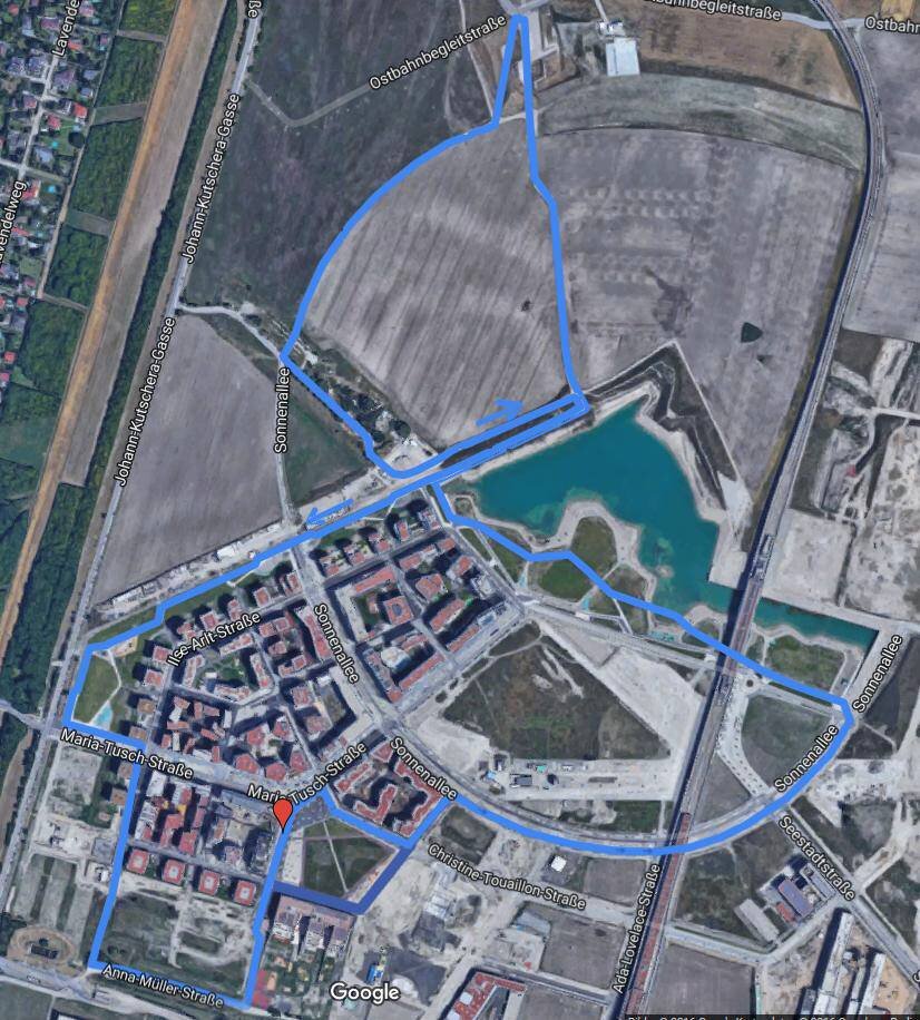 Aus der Vogelperspektive einen Teil des Stadtgebiets Seestadt sowie den See mit einer Einzeichnung wo die die Befahrung der Straße umgeleitet wird