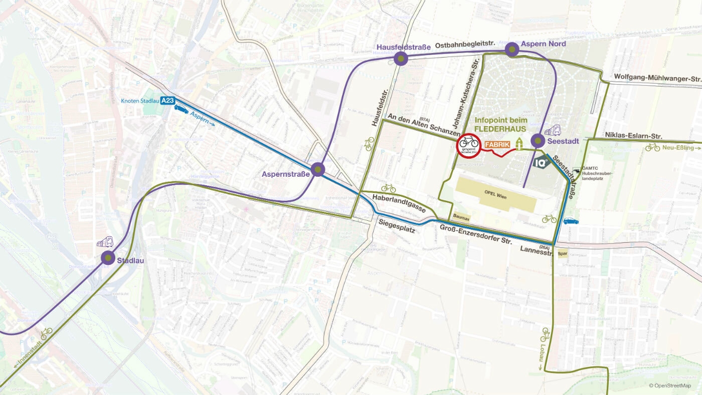Aus der Vogelperspektive einen Teil des Stadtgebiets Seestadt sowie den See mit einer Einzeichnung wo die die Befahrung der Straße umgeleitet wird