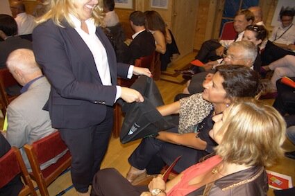 Ausgehend von einem Euro Spielkapital, das die 122 TeilnehmerInnen zu Beginn erhielten, stellte sich für jede/n die Frage: egoistisch handeln, mit der Aussicht auf Gewinn, oder das Gemeinwohl unterstützen. Die Spielregel dazu: der Euro kann anonym in einen Gemeinschaftstopf eingezahlt werden, die Summe wird verdoppelt und zu gleichen Teilen an alle wieder ausgezahlt. Unabhängig davon, ob sie eingezahlt haben oder nicht. Das bedeutet, dass wenn theoretisch alle einzahlen, der Gemeinschafts- und der individuelle Gewinn maximiert wären. Trotzdem gibt es immer EgoistInnen, die auf einen höheren individuellen Nutzen setzen. Dieser Ein- und Auszahlungsprozess wiederholte sich vier Mal. Dazwischen wurde die Stimmung abgefragt und einem Stimmungsbarometer festgehalten.