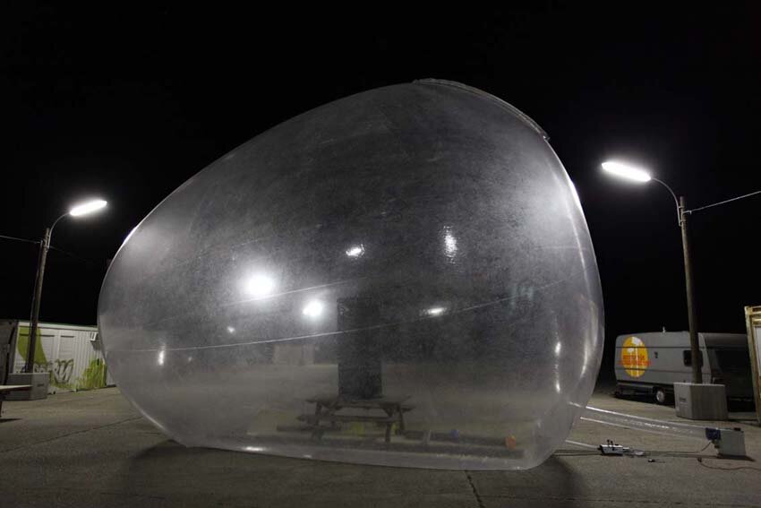 Aus der Vogelperspektive einen Teil des Stadtgebiets Seestadt sowie den See mit einer Einzeichnung wo die die Befahrung der Straße umgeleitet wird
