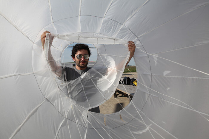 Am Wochenende fand bei günstigen Windverhältnissen am PUBLIK-Areal der Praxisteil des Moduls „experimenteller Hochbau“ der TU Wien als Gemeinschaftsprojekt mit der Abteilung Textil der Universität für angewandte Kunst statt. Titel: „Fliegende und schwimmende Architektur“. Vor Ort loteten die Studierenden das Spannungsfeld zwischen Flugfeld Aspern und aspern Die Seestadt Wiens aus.