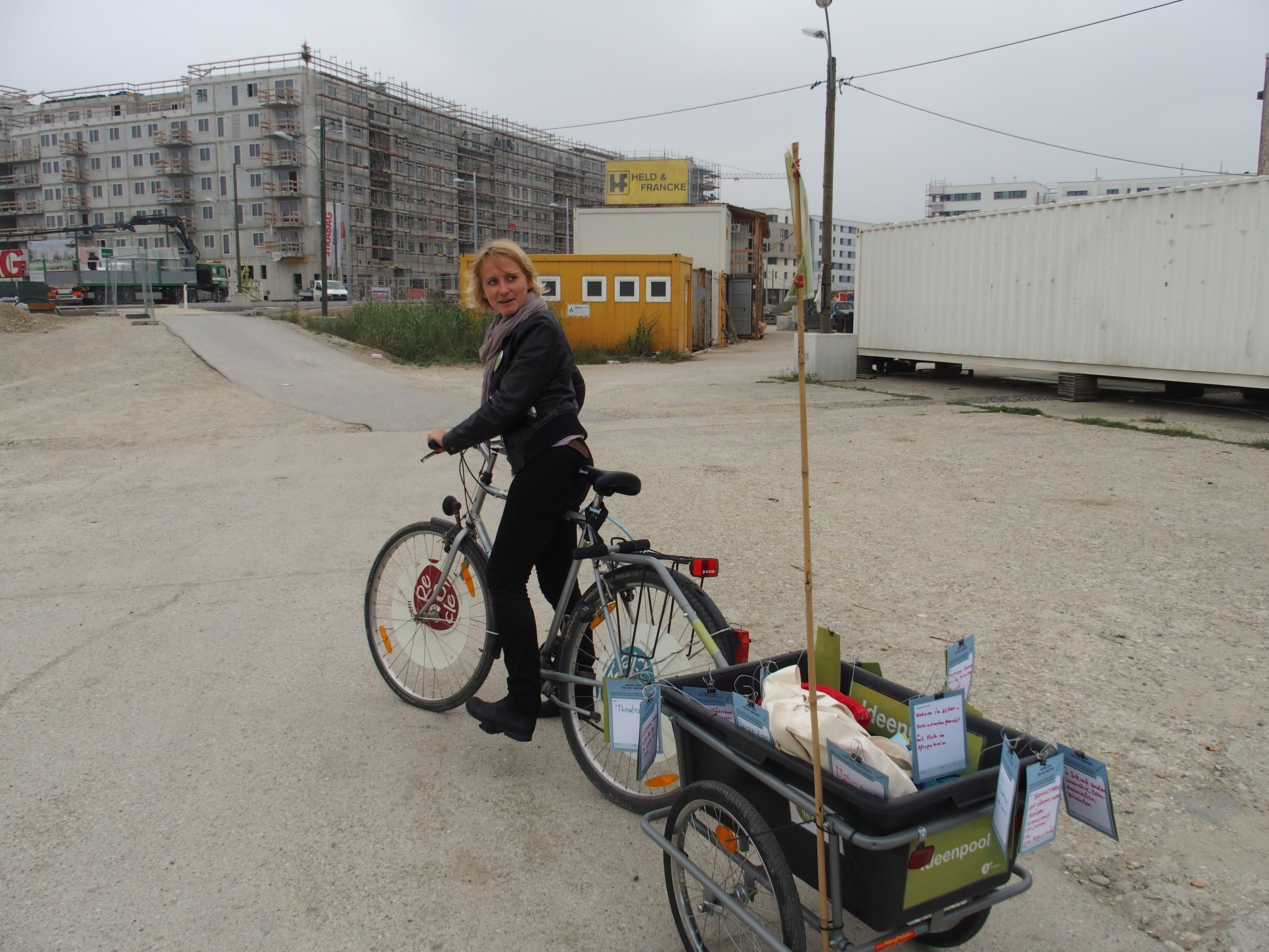 Menschen zu Fuß und mit Rad fahren vor einer urbanen Skyline der Seestadt mit direkter U-Bahn Anbindung