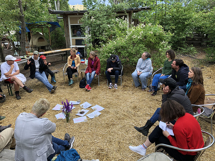Gießrad, gemeinschaftliches Kompostieren, Seestadt Lounge, ein Lehr- und Erlebnispfad und vieles mehr – all diese Bausteine einer grünen und essbaren Seestadt sollen jetzt Realität werden! Viele Schritte wurden bereits gesetzt, einiges ist noch zu tun – gemeinsam gelingt das am besten!Am 3. Juni 2020 ging auf der Transition Base nordwestlich des Sees der fünfte Salon EssBAR des Forschungsprojektes Essbare Seestadt über die Bühne. Ein bunter Projekt-Teppich!Das Forschungsprojekt Essbare Seestadt und der gerade gegründete Verein SeeStadtgrün verschaffte sich gemeinsam mit den TeilnehmerInnen beim 5. Salon EssBAR einen Überblick zu Projekten und Initiativen. Die Vielzahl und Vielfalt wurde an diesem Abend deutlich – so entstand ein ganzer Teppich an Projekten in der Mitte des TeilnehmerInnenkreises. Bereits in der Seestadt gelandet sind mit der Unterstützung von SeestädterInnen, Bezirk Donaustadt und weiteren AkteurInnen beispielsweise ein Heilkräutergarten bei der Seestadt-Apotheke, ein Wartegarten für die Seestadt Praxis und ein Lesegarten bei den Seeseiten. Weitere Projekte sollen nun folgen! Wer hilft beim Gießen?Nach dem Überblick zu den Projekten wurde im informellen Teil des Salons EssBAR über Unterstützungsmöglichkeiten und Synergien diskutiert. Außerdem freuten sich die TeilnehmerInnen über die Staffelübergabe von der T-Base an den neu gegündeten „Verein SeeStadtgrün – mehr Natur in die Stadt“.Der von BewohnerInnen getragene Verein SeeStadtgrün setzt sich ab sofort für mehr (essbares) Grün, Schatten und Aufenthaltsqualität im öffentlichen Raum ein. SeestädterInnen mit ähnlichen Anliegen sind beim Verein herzlich willkommen. Denn gemeinsam gelingen die Dinge am besten! Mehr Infos auf www.essbareseestadt.at