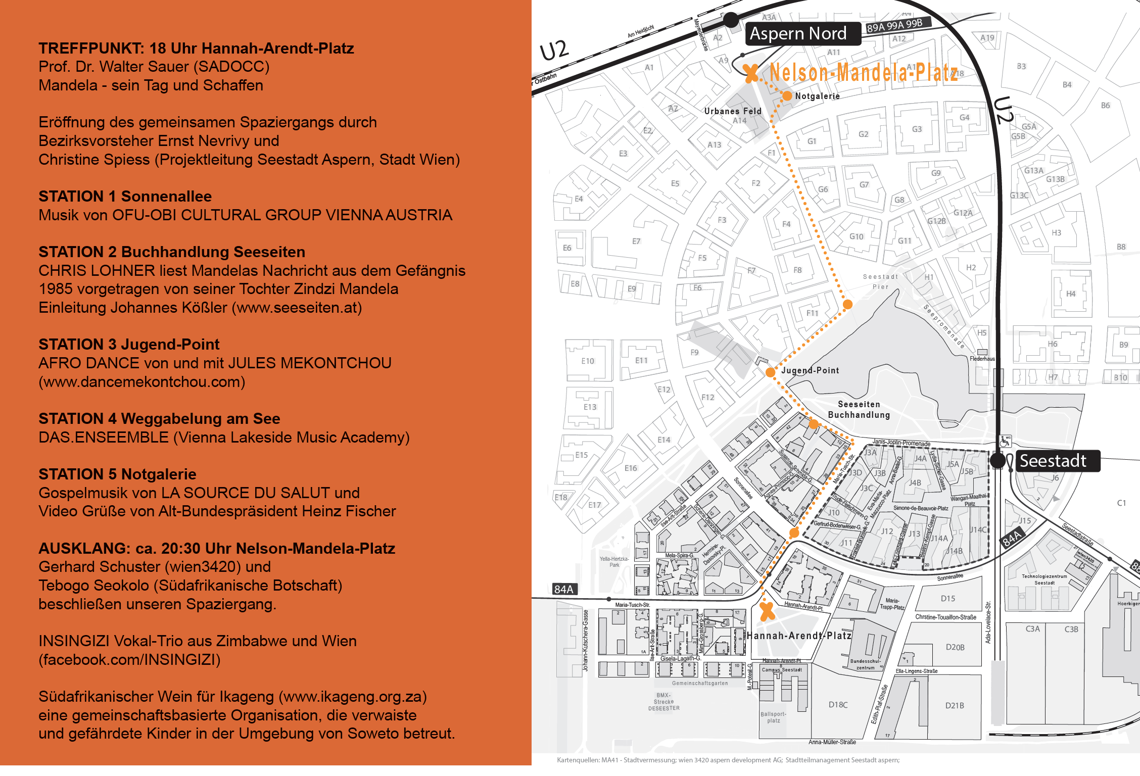 Wussten Sie schon, dass der führende südafrikanische Anti-Apartheid-Kämpfer Nelson Mandela heuer seinen 100. Geburtstag gefeiert hätte?Aus diesem Grund laden auch heuer wieder SADOCC und FreundInnen herzlichst ein, am weltweiten Nelson-Mandela-Gedenktag gemeinsame Schritte zu setzen! Spaziergang zum Nelson-Mandela-PlatzTreffpunkt für diesen besonderen Spaziergang ist am 18. Juli der Hannah-Arendt-Platz in aspern Seestadt um 18.00 Uhr.BesucherInnen und BewohnerInnen wandern vom Hannah-Arendt-Platz über mehrere Stationen mit Lesung, Musik und Beiträgen zu Leben und Schaffen von Nelson Mandela zu dem 2016 offiziell benannten Nelson-Mandela-Platz beim URBANEN FELD/ Aspern Nord. HintergrundDer jährliche Gedenktag, initiiert von den Vereinten Nationen, ruft am Geburtstag des 2013 verstorbenen Aktivisten dazu auf, Verantwortung zu übernehmen und die Welt Schritt für Schritt zu verbessern.Das Motto Tu etwas. Rege zum Wandel an!/Take action. Inspire change! soll dazu bewegen, eine friedliche, nachhaltige und gerechte Welt zu schaffen.Nelson Rolihlahla Mandela war ein führender südafrikanischer Anti-Apartheid-Kämpfer sowie von 1994 bis 1999 der erste schwarze Präsident seines Landes. Aufgrund seiner Aktivitäten gegen die Apartheidspolitik in seiner Heimat musste Mandela 27 Jahre als politischer Gefangener in Haft verbringen. Er gilt als einer der im 20. Jahrhundert international herausragendsten Vertreter im Kampf für Freiheit, gegen Rassentrennung, Unterdrückung und soziale Ungerechtigkeit. 1993 erhielt er den Friedensnobelpreis.Das Dokumentations- und Kooperationszentrum Südliches Afrika (SADOCC) unterstützt das freie Südafrika beim Aufbau einer nicht-rassistischen und sozial gerechten Gesellschaft. Der Mandela-Tag Wien soll diesen globalen Gedanken lokal repräsentieren. Treffpunkt18.00 Uhr, Hannah-Arendt-PlatzEndpunktca. 20.30 Uhr, Nelson-Mandela-Platz Weitere Informationen und Kontaktehttp://www.sadocc.athttps://www.facebook.com/events/1719784471450867Weitere Informationen, Flugblatt zum Download:https://www.dropbox.com/sh/lch6sy3niq1j3kz/AADp6V7wWTa3vmD6_DdzqK0da?dl=0