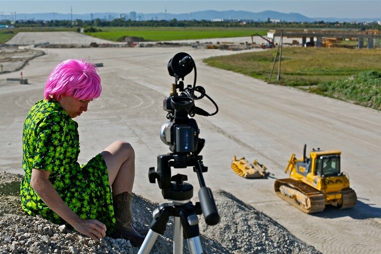 Eine Person mit blondem Pferdeschwanz und schwarzen Kopfhörern blickt von einem Ufer über das Wasser auf moderne Wohngebäude und Grünflächen in der Seestadt.