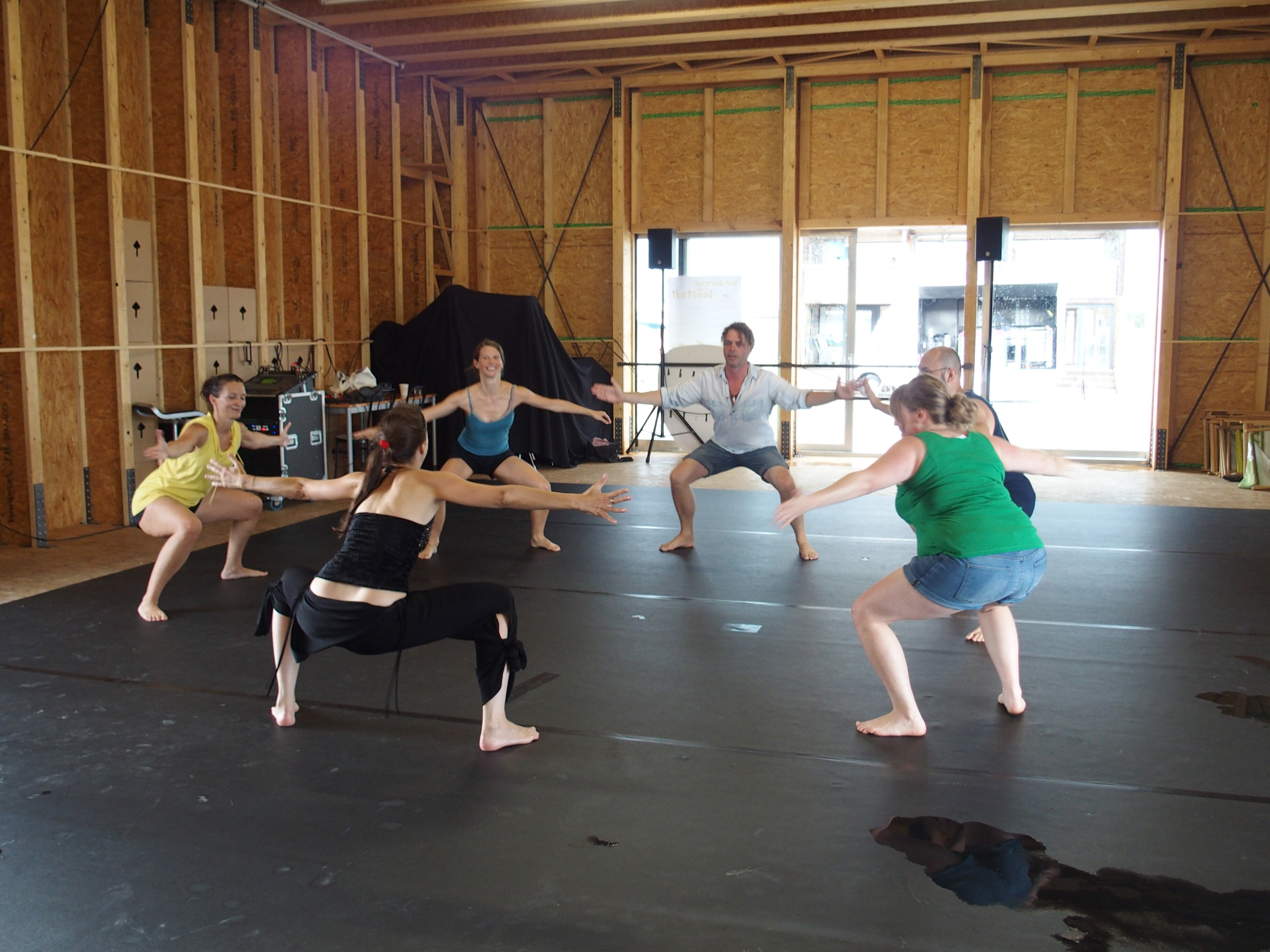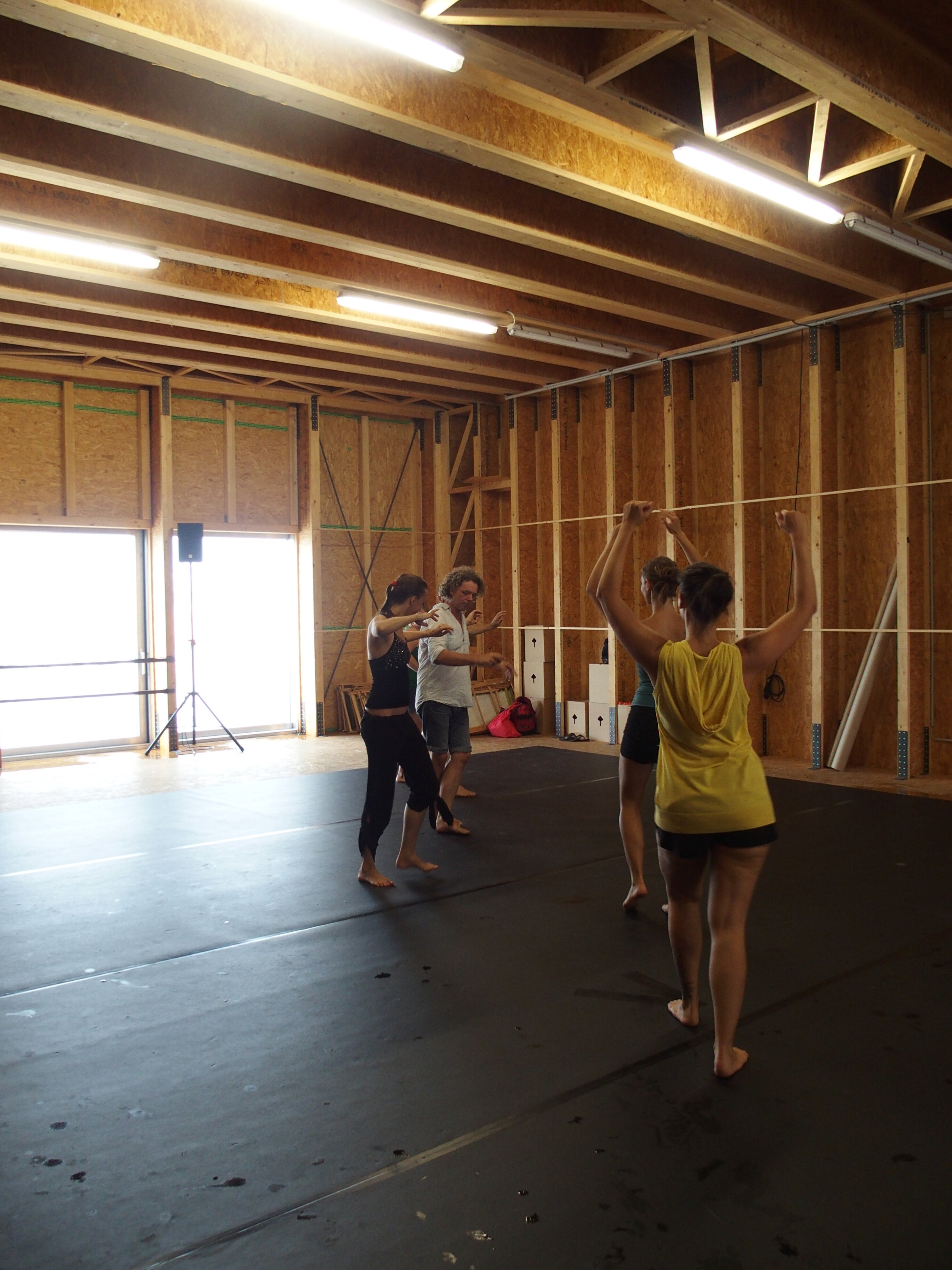 3 Frauen stehen verkleidet als Namensgeber*innen der Straßennamen in der Seestadt vor einer Hauswand