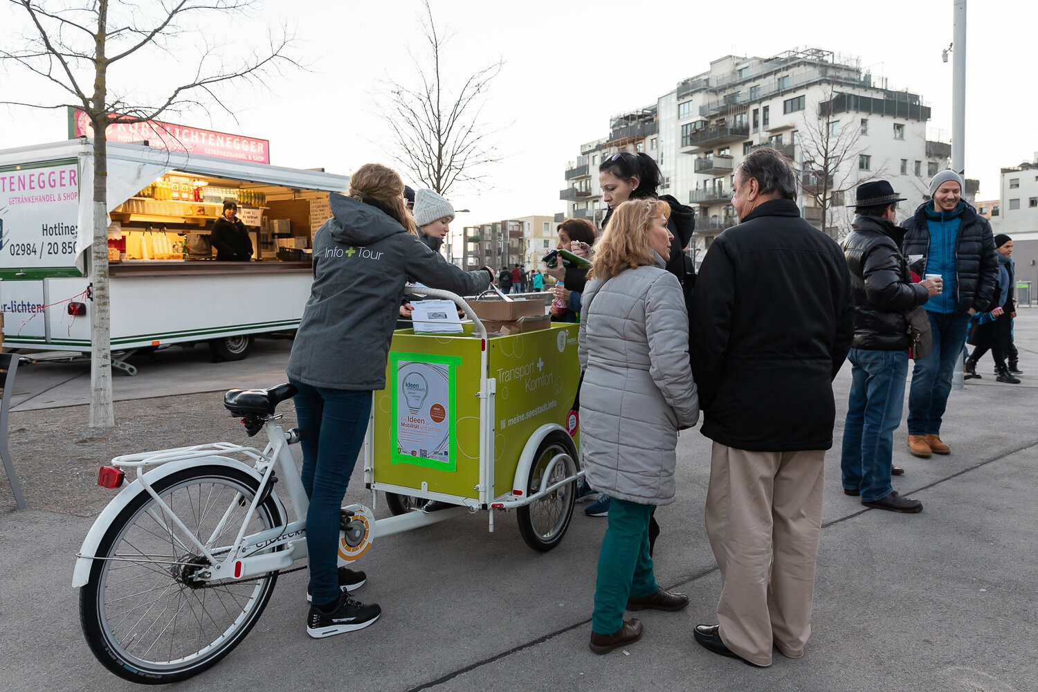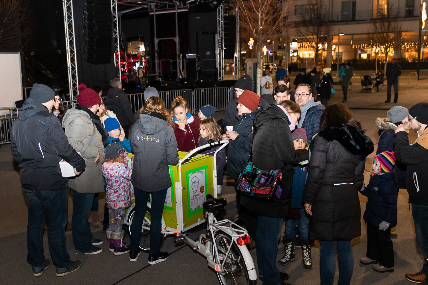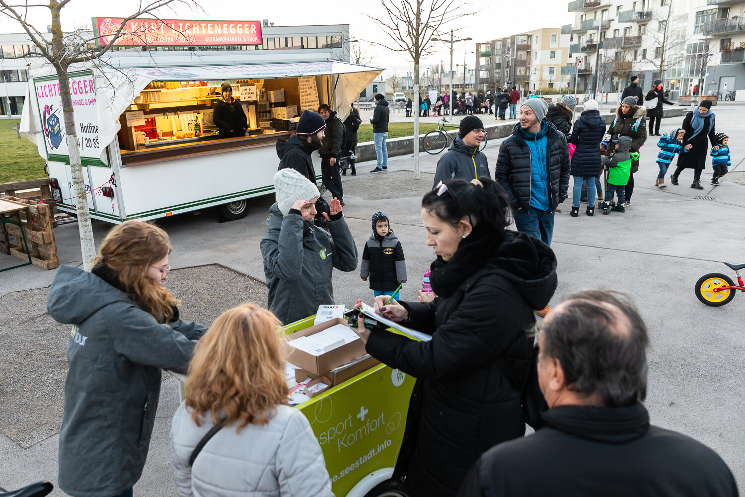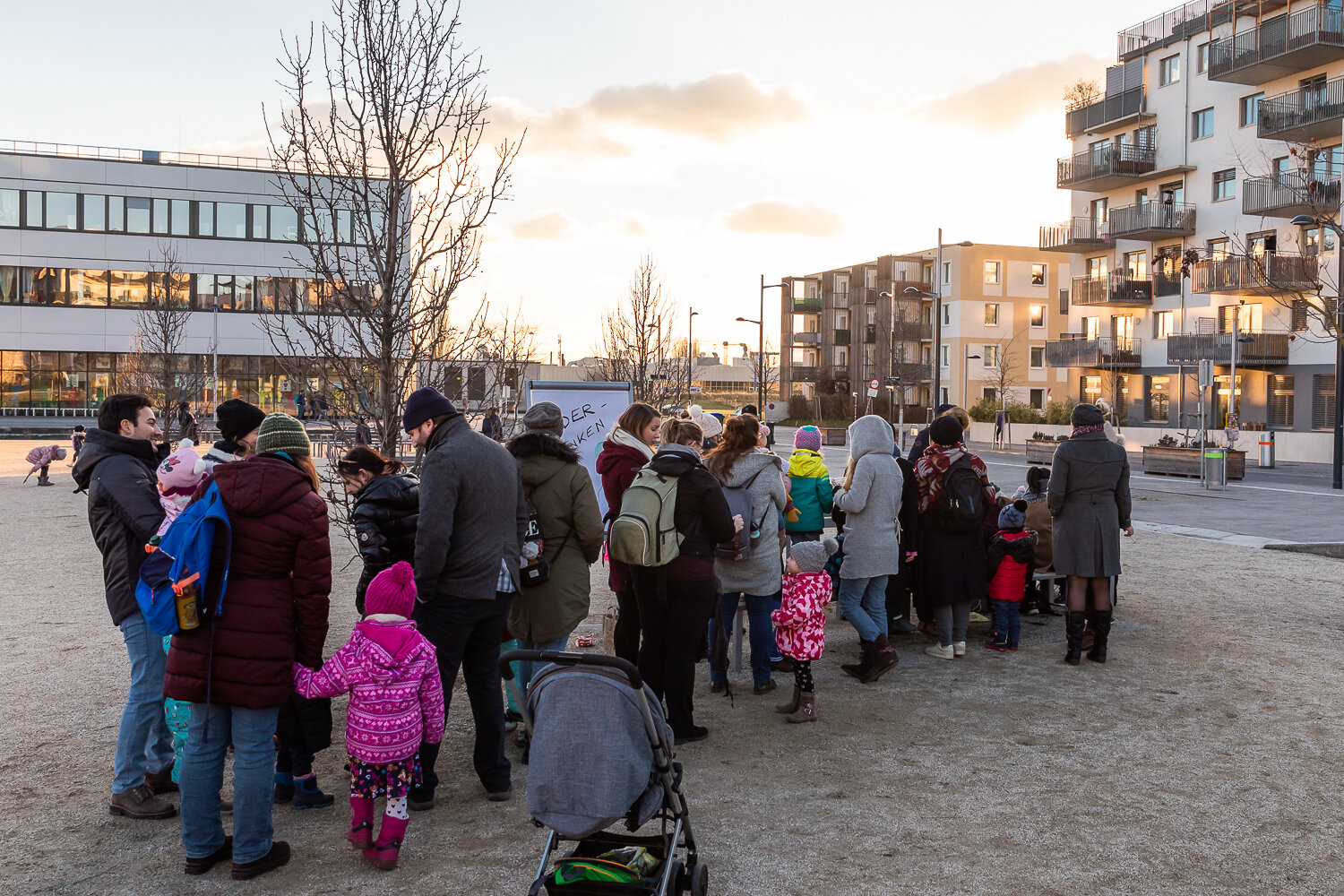 Der Wiener Silvesterpfad führte zum 4. Mal mitten durch die Seestadt - mit einem bunten Programm für Jung und Alt. Nach dem Familien-Silvester, bei dem unter anderem die Multimedia-Künstler des seeLAB die jungen SeestädterInnen zum Experimentieren mit Licht und Formen einluden, gab es am Abend Partystimmung. Die „Hitgiganten“ und „Wiener Wahnsinn“ heizten etlichen hundert Gästen am vollen Hannah-Arendt Platz ordentlich ein.Klassischer aber nicht weniger lustig ging es bei der Live-Übertragung der „Fledermaus“ aus der Wiener Staatsoper zu – dazu hatte das seeLab-Team das jot12 mit viel Liebe und gekonnten Projektionen zur Opern-Außenstelle umgestaltet und für Getränke und Snacks gesorgt. Das Lastenrad des Stadtteilmanagement hatte eine besondere Fracht zum Jahreswechsel:Als tolles Give-Away verteilte das Seestadt-Team tolle VR-Brillen der VHS Donaustadt, mit denen man in 3D in die Zukunft schauen kann – nämlich in die des Seeparkquartiers ; ).Wer schon eine VR-Brille hat, kann das hier gleich ausprobieren.Wer die Gelegenheit verpasst hat, kann sich seine VR-Brille auch bei uns im Stadtteilmanagement abholen. Alle Informationen finden Sie hier.