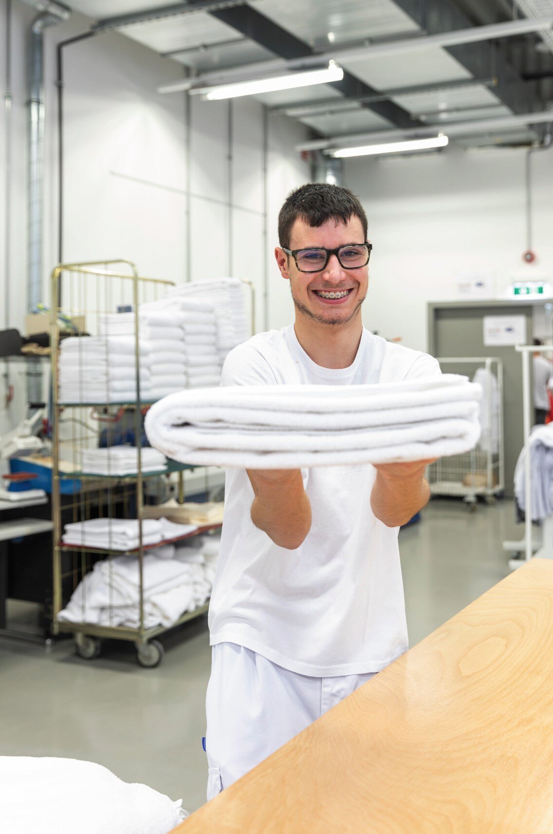 Im auf der gegenüberliegenden Seite liegenden langgestreckten Gebäude befindet sich die Textilreinigung und das Bügel- und Nähservice. Mitarbeiter des Integrativen Betriebs und Lehrlinge vom Team der Ausbildungsbeauftragten Elisabeth Böhm arbeiten hier gemeinsam in strahlend weißer Berufsbekleidung, um zum Beispiel Hotels oder Rettungsorganisationen mit hygienisch sauberer Wäsche zu versorgen. Nach einer erfolgreichen Lehrabschlussprüfung werden die wienwork-Absolventen in der Regel auf einen externen Arbeitsplatz vermittelt. Für ein gutes Gelingen setzt sich ein multidisziplinäres Team, inklusive Fachpädagogik, Sozialarbeit und psychologischer Beratung ein.
