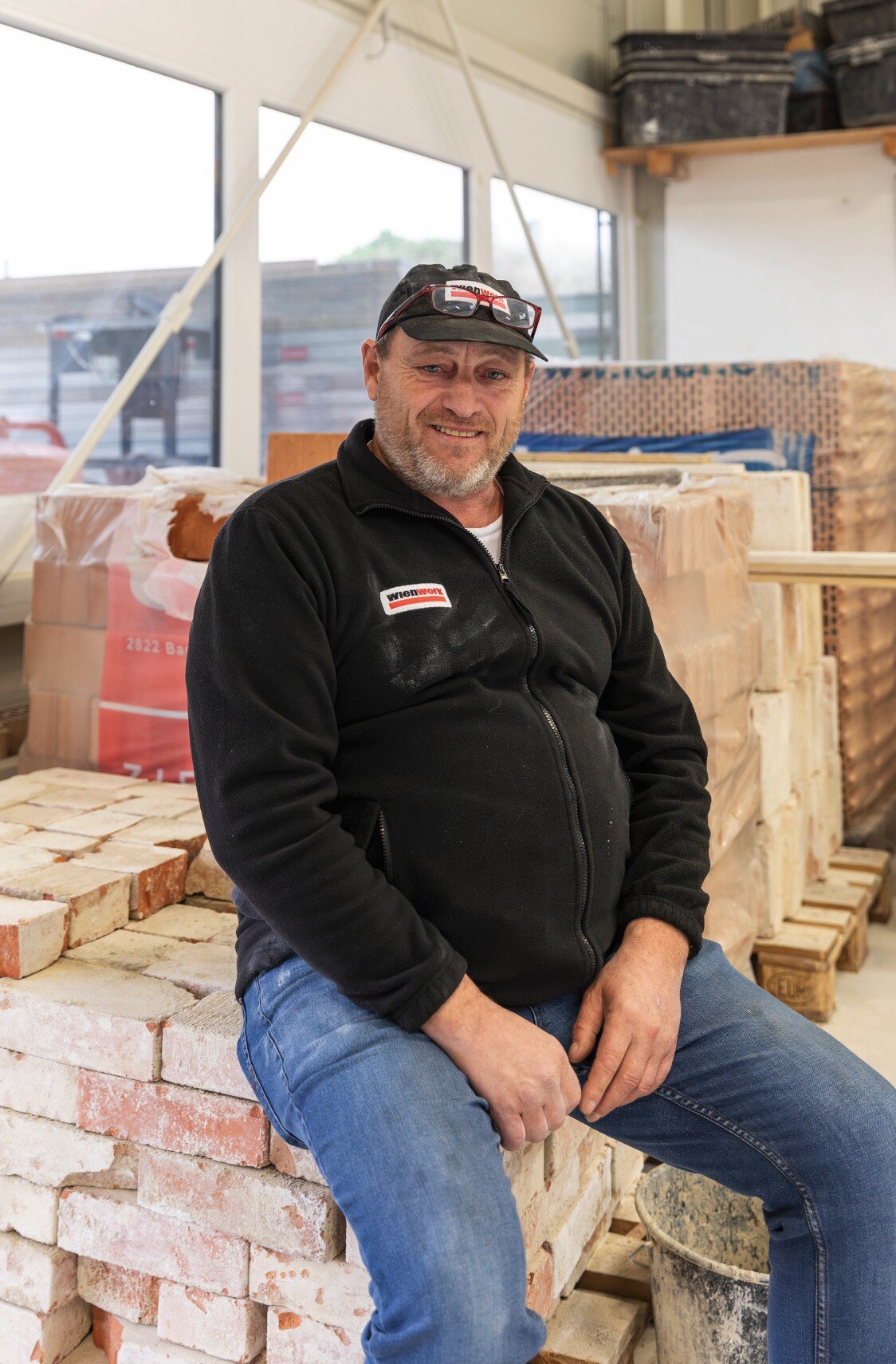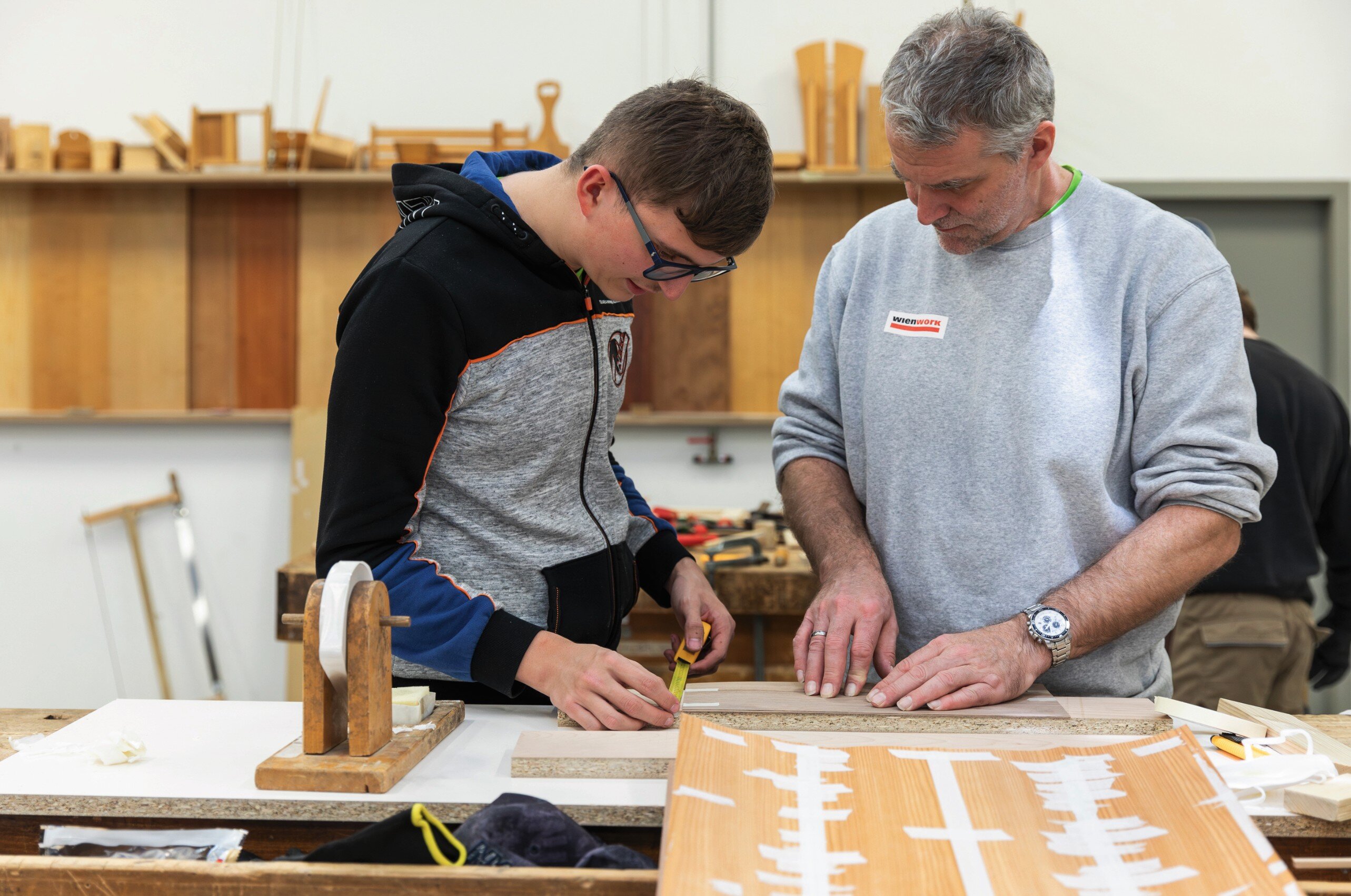 In der Hochbau-Werkstätte erlernen Lehrlinge das Maurerhandwerk seit sieben Jahren von Manfred Binder mit der Besonderheit, dass beim Aufmauern einer Wand interessanterweise kein Zement verwendet wird. „Weil der Mörtel sich so nicht verfestigt, können wir das Material wieder abreiben und immer wieder einsetzen“, erläutert Binder.