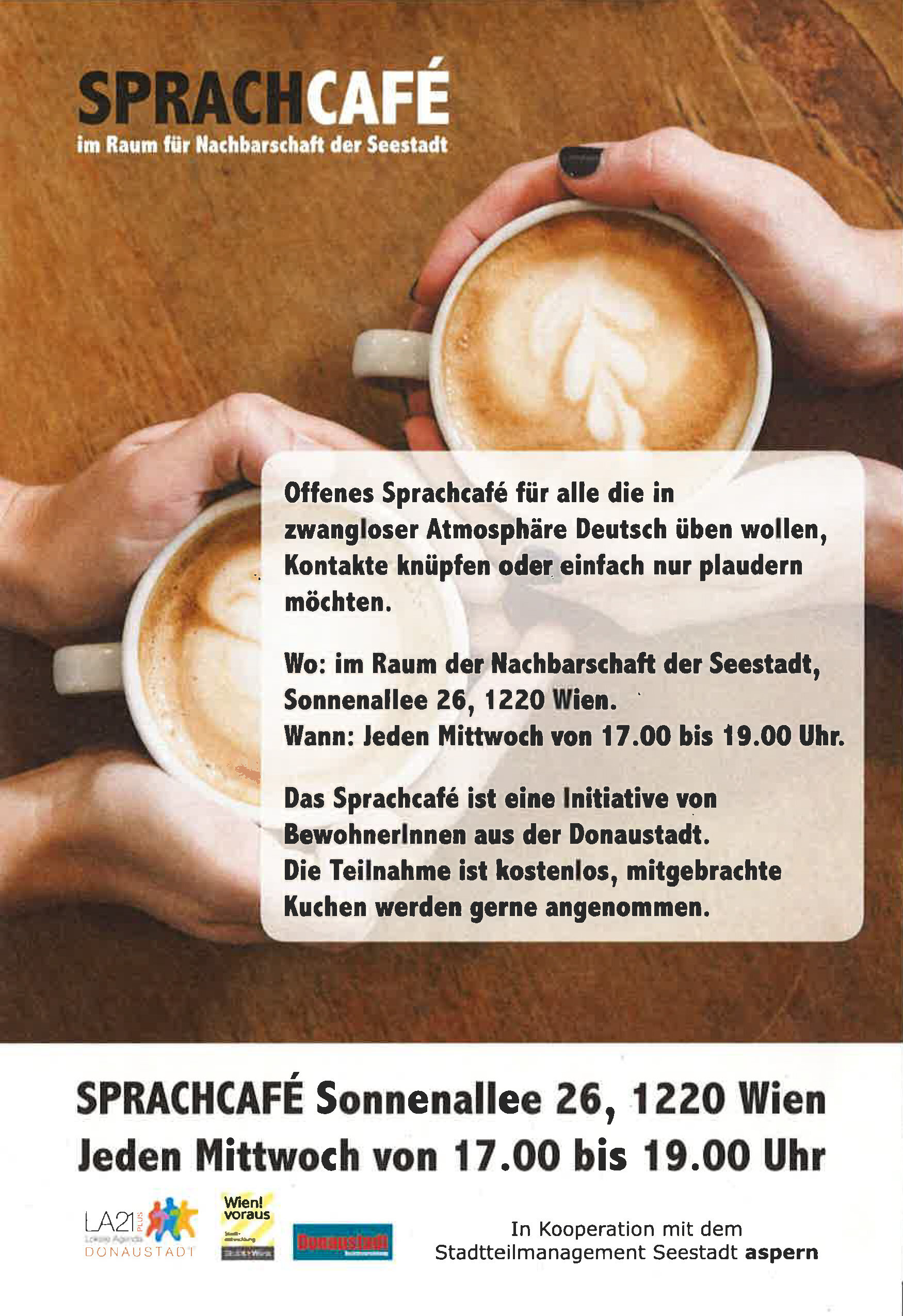 Das offene Sprachcafé lädt alle ein, die in netter Atmosphäre Deutsch üben, Menschen kennenlernen oder einfach nur plaudern möchten. Ab 20. Februar 2019 jeden Mittwoch von 17.00 bis 19.00 Uhr im Raum für Nachbarschaft.Die Teilnahme ist kostenlos. Mitgebrachte Kuchen unterstützen die Kaffeehaus-Atmosphäre und werden gerne angenommen.Kommen Sie vorbei und lernen Sie die Vielfalt Ihrer Nachbarschaft kennen und hören! Bei Fragen wenden Sie sich an das Stadtteilmanagement Seestadt aspern: fragen@meine.seestadt.info. Language CaféOpen language café for all who want to practice German in a relaxed atmosphere, socialize or just want to chat. Every Wednesday from 5 to 7 pm. The participation is free, brought cakes are gladly accepted. Where?Raum für Nachbarschaft, Sonnenallee 26, 1220 Wien When?Every Wednesday vom 5 to 7 pm (Start: 20th Feb. 2019)If there is any question left, please contact Stadtteilmanagement Seestadt aspern: fragen@meine.seestadt.info. KontaktStadtteilmanagement Seestadt aspernHannah-Arendt-Platz 1 (Erdgeschoß), 1220 Wien+43 1 33 66 00 99fragen@meine.seestadt.info ÖffnungszeitenMontag 9.00–13.00 UhrDienstag 9.00–13.00 Uhr und 14.00–18.00 UhrMittwoch geschlossenDonnerstag 9.00–13.00 Uhr und 14.00–19.00 UhrFreitag 13.00–17.00 UhrDas Sprachcafé ist eine Initiative von BewohnerInnen aus der Donaustadt und wird von der AgendaDonaustadt unterstützt.