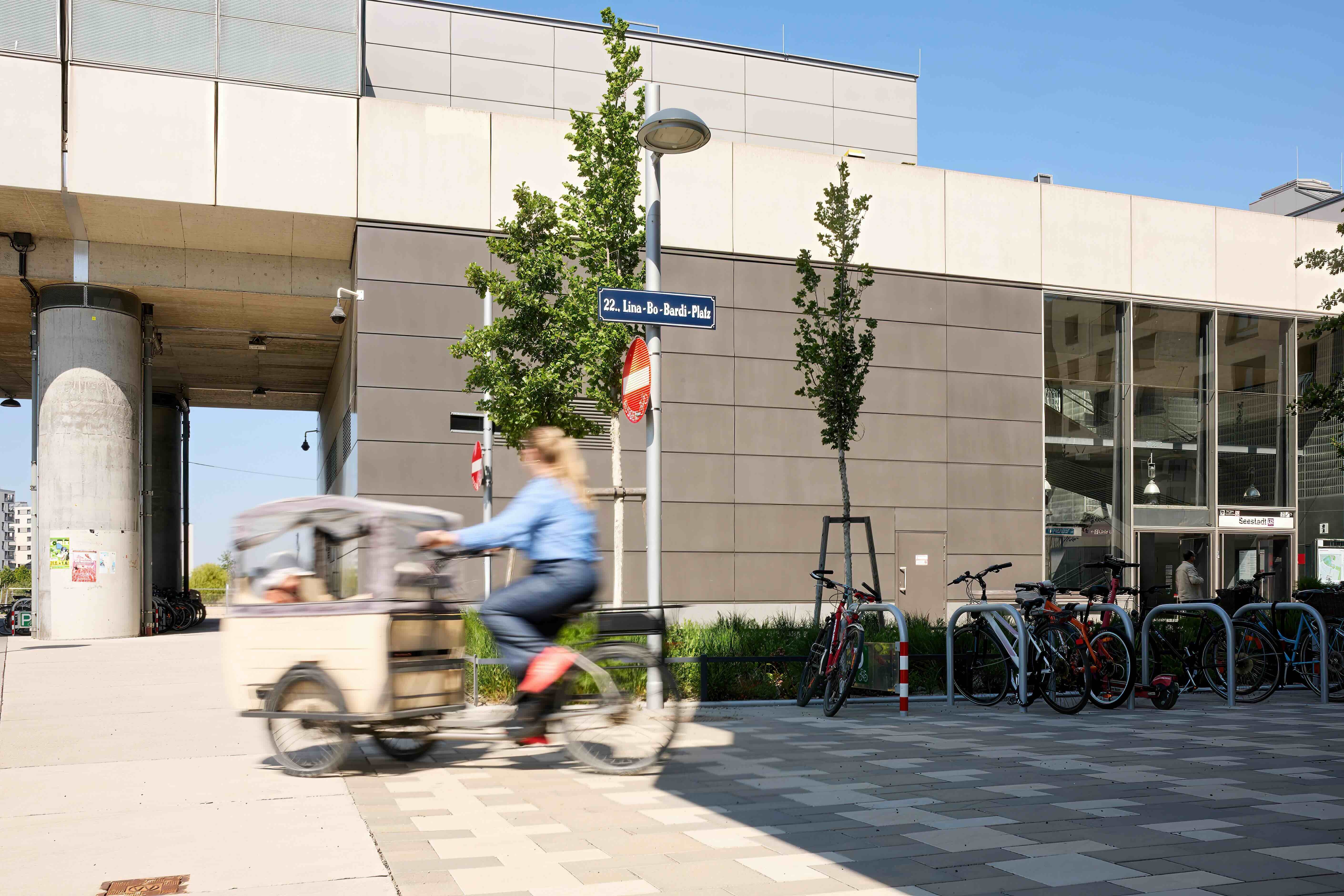 Der Lina-Bo-Bardi-Platz bei der U-Bahn-Station ist das Eintrittstor in die Seestadt. © Luiza Puiu