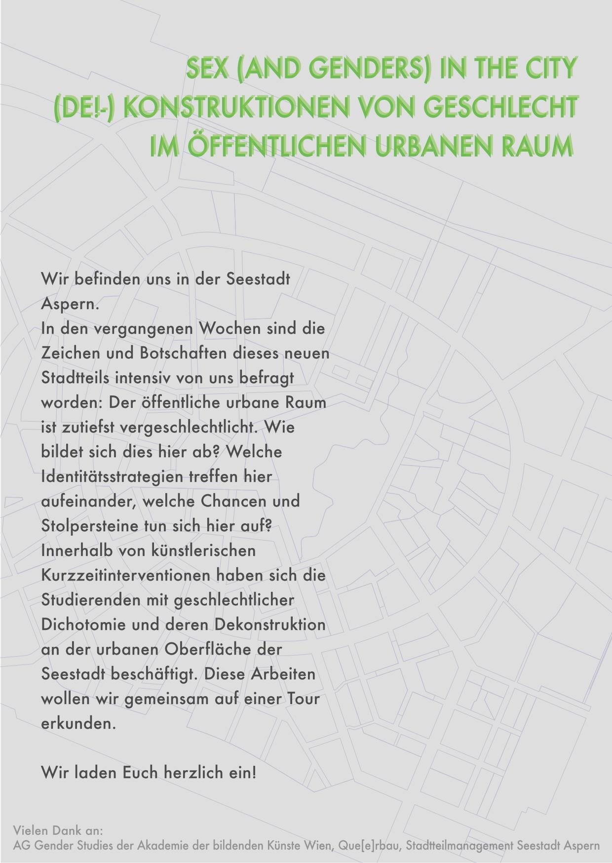 (De!-)Konstruktionen von Geschlecht im öffentlichen urbanen Raum Im Rahmen einer Lehrveranstaltung haben sich Architektur-Studierende der Akademie der bildenden Künste mit (De-)Konstruktionen von Geschlecht im öffentlichen urbanen Raum auseinandergesetzt. Ein Ergebnis daraus ist eine geführte Tour durch die Seestadt: Freitag, 20. Mai 2016, 11 Uhr - Treffpunkt: Hannah-Arendt-Platz 1, 1220 Wien.