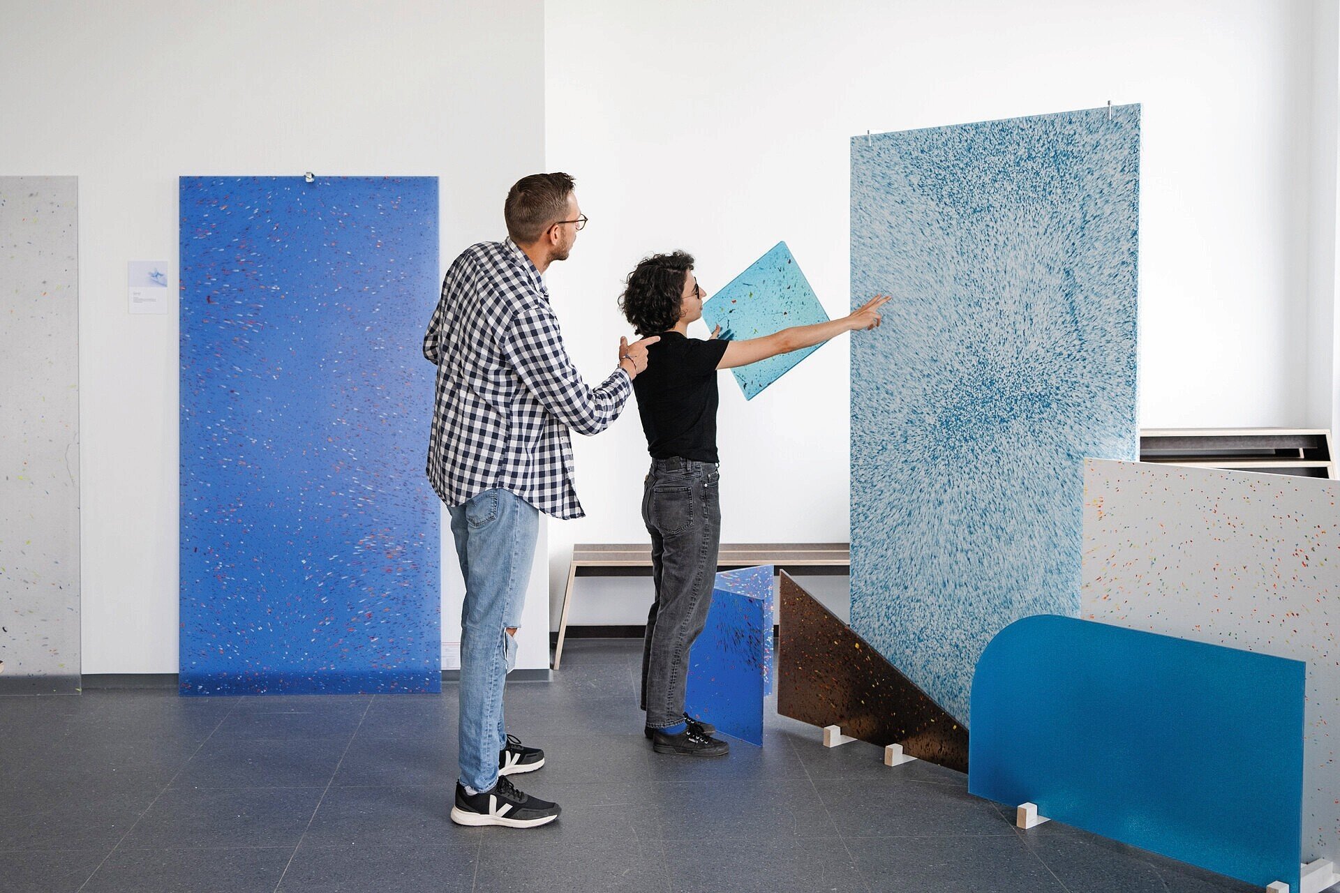 „Derzeit machen wir fünf Gründer alles selbst und stehen an der Heiß- und der Kaltpresse, die eigens für uns angefertigt wurden“, schildert Scuderi. Als Zusatzleistungen werden der individuelle Zuschnitt und, ab einer größeren Stückzahl, individuelles Design angeboten. Noch ist die Produktion von Paneelen auf etwa 100 Stück pro Monat begrenzt. Sie finden sich aber schon in den Materialportfolios einiger Architekten und Designbüros – und vielleicht bald in Wohnungen, Restaurants oder Büros.