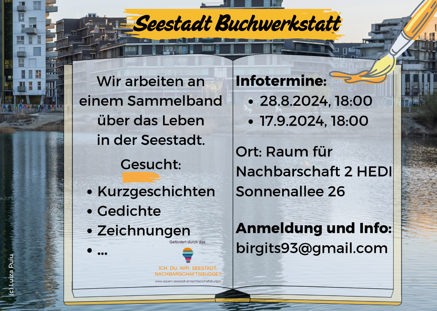 Schreiberlinge, Dichterinnen und Dichter, Künstler und Künstlerinnen, Kreative aufgepasst: In der Buchwerkstatt arbeiten wir gemeinsam an einem Sammelband mit Texten (von Kurzgeschichten bis zu Gedichten) und Zeichnungen über das Leben in der Seestadt und die Gedanken der Seestädter und Seestädterinnen. Der Kreativität sind keine Grenzen gesetzt, Vorkenntnisse sind nicht notwendig. Jeder Teilnehmer und jede Teilnehmerin erhält am Ende der Buchwerkstatt ein Buchexemplar mit seinem Werk. Das Buch wird außerdem der Öffentlichkeit zugänglich gemacht. Die Werkstatt wird von regelmäßigen Treffen zum Austausch über Ideen und Fortschritte und kleine Impulsvorträge begleitet.