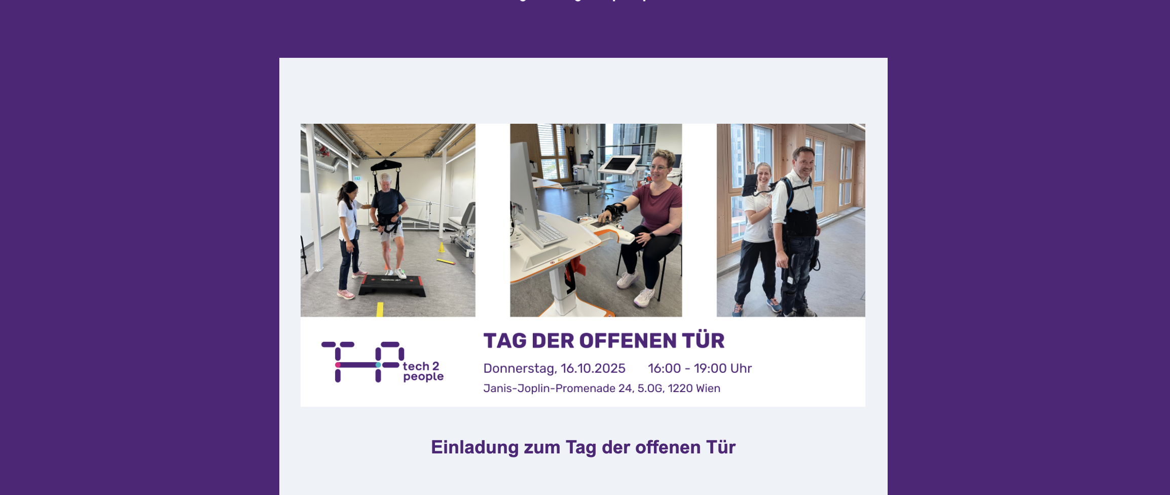 Entdeckt unsere Geräte bei spannenden Führungen, tauschen Sie sich direkt mit Therapeut:innen aus und besuchen Sie um 17:00 Uhr unseren Vortrag zu den Therapieabläufen bei tech2people.