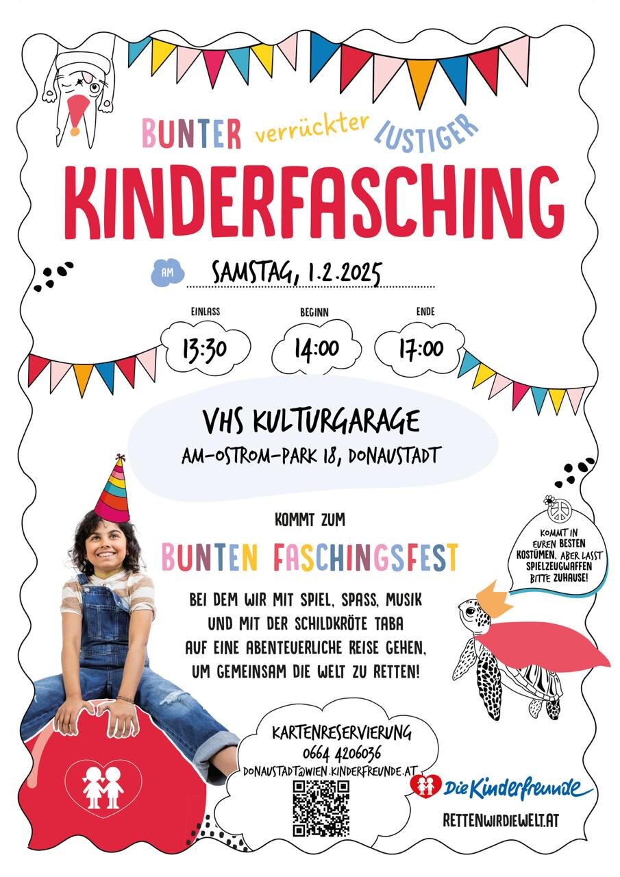 - Kartenreservierung unter https://pretix.eu/WienerKinderfreunde/faschingdonaustadt2024, 0664/42 06 36 oder donaustadt@wien.kinderfreunde.at