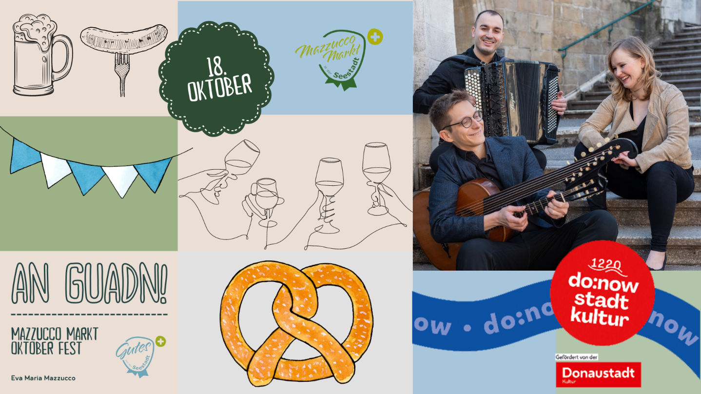 Am 18. Oktober verwandelt sich der Mazzucco Markt in der Seestadt Aspern in ein herbstliches Oktoberfest. Das Highlight des Tages ist der musikalische Auftritt der Band Weana Gspia um 16:00 Uhr.