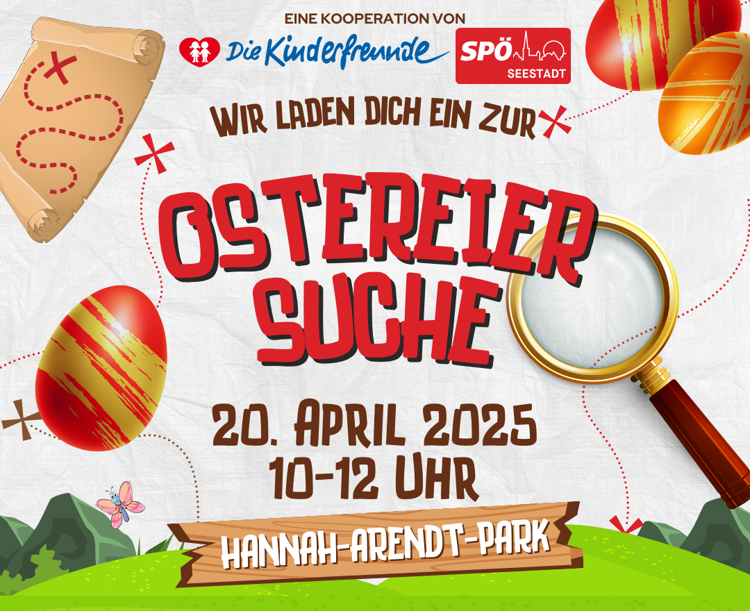 Die Kinderfreunde Donaustadt und die SPÖ Seestadt veranstalten eine fröhliche Ostereiersuche für alle Kinder.