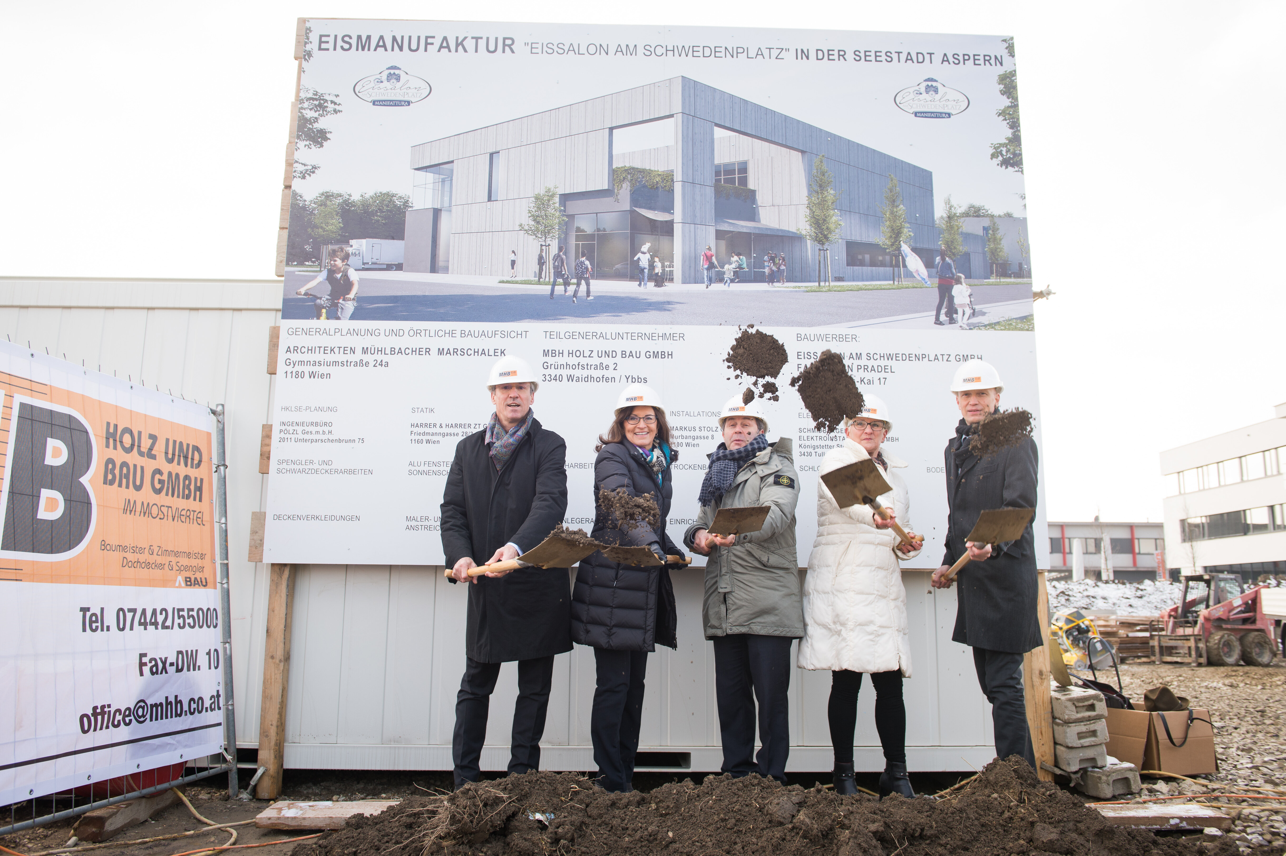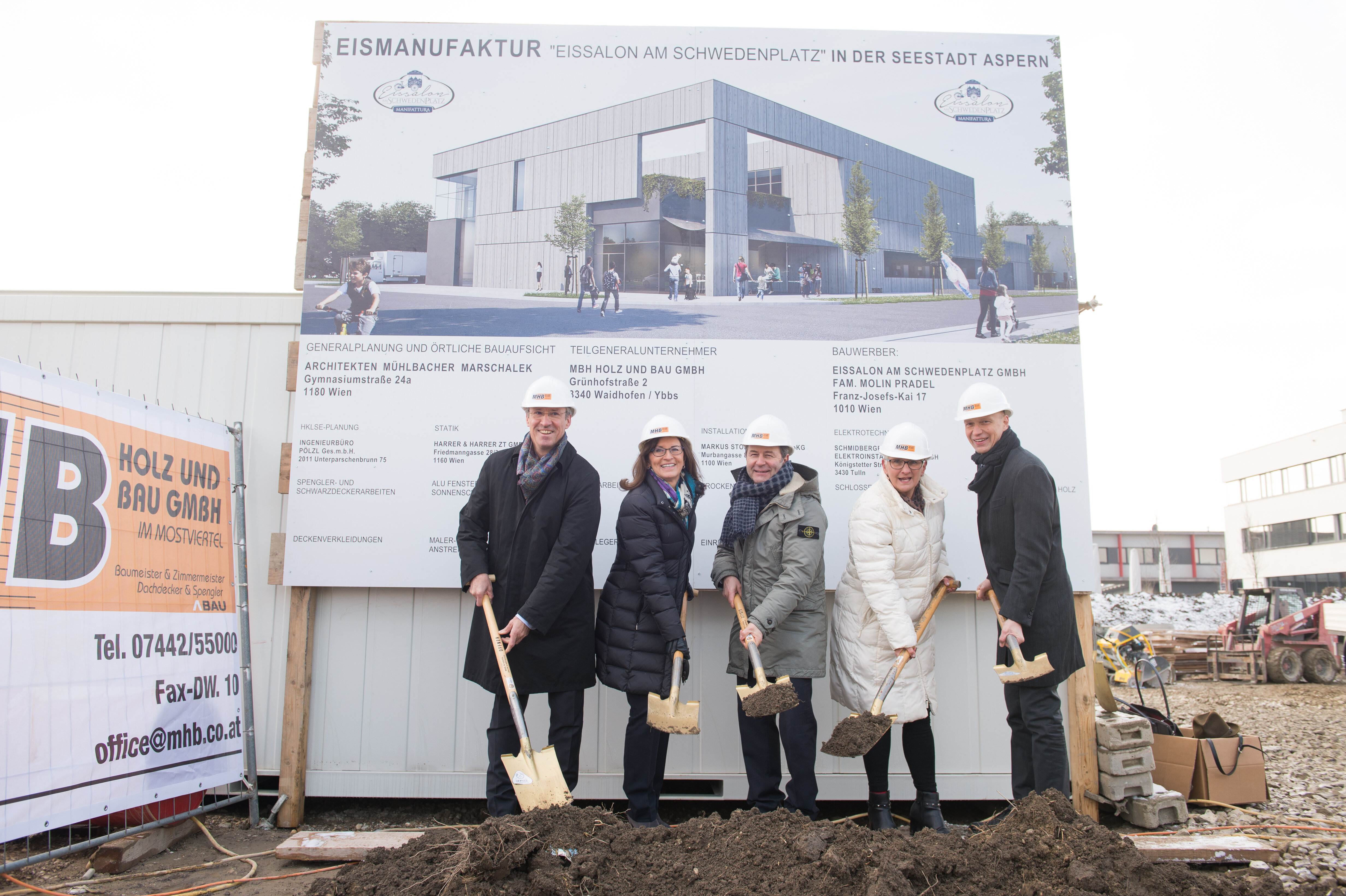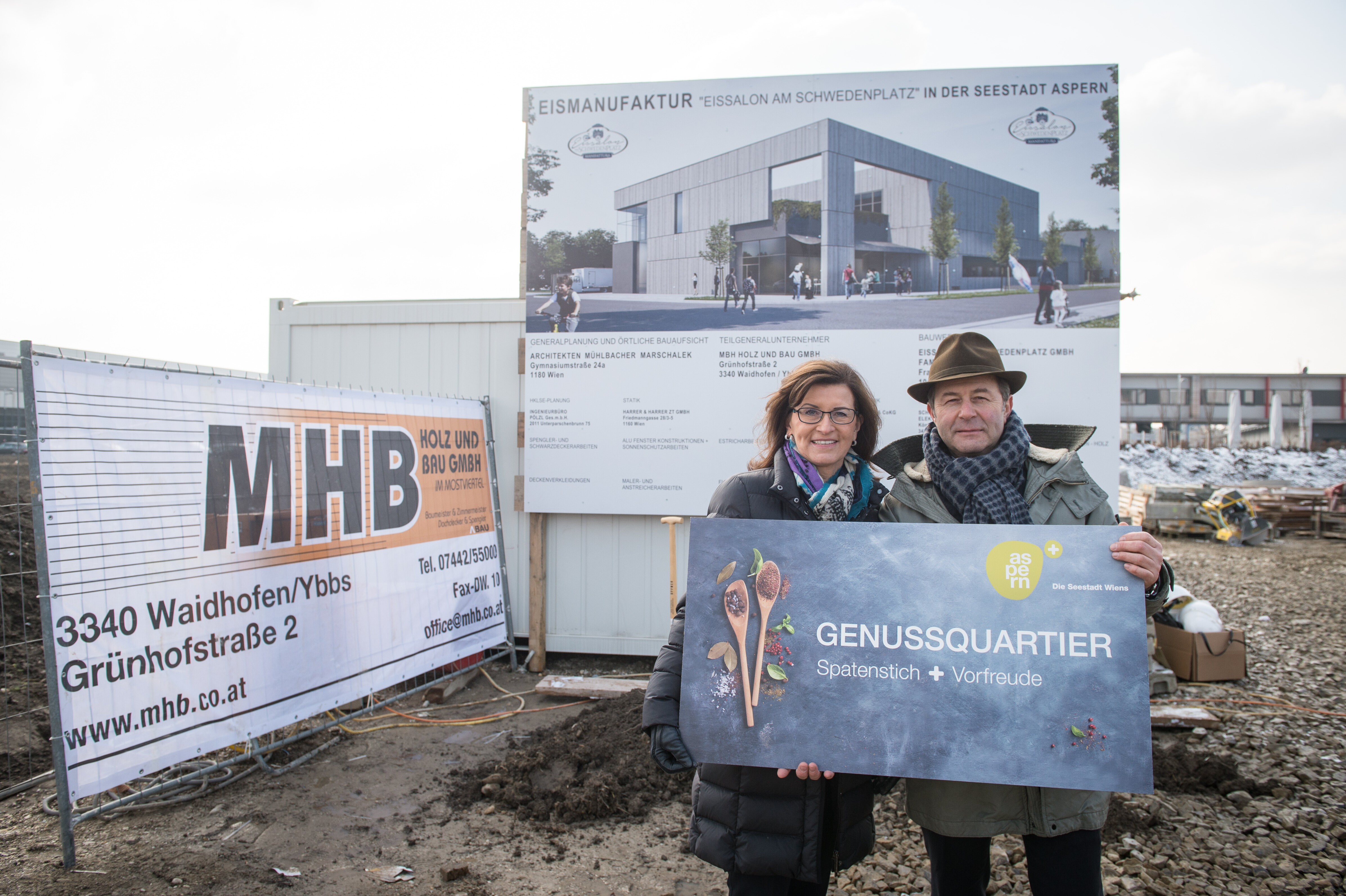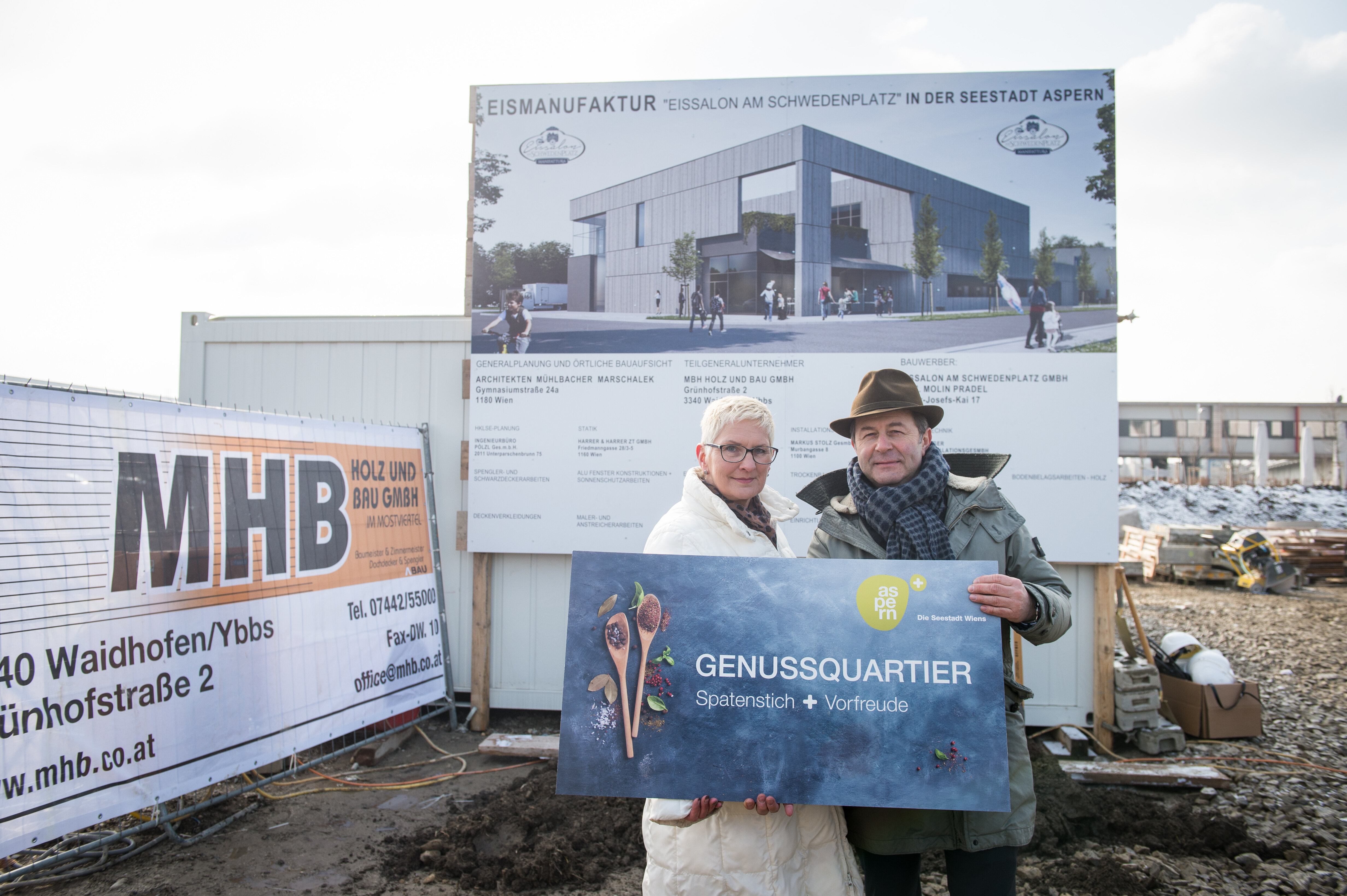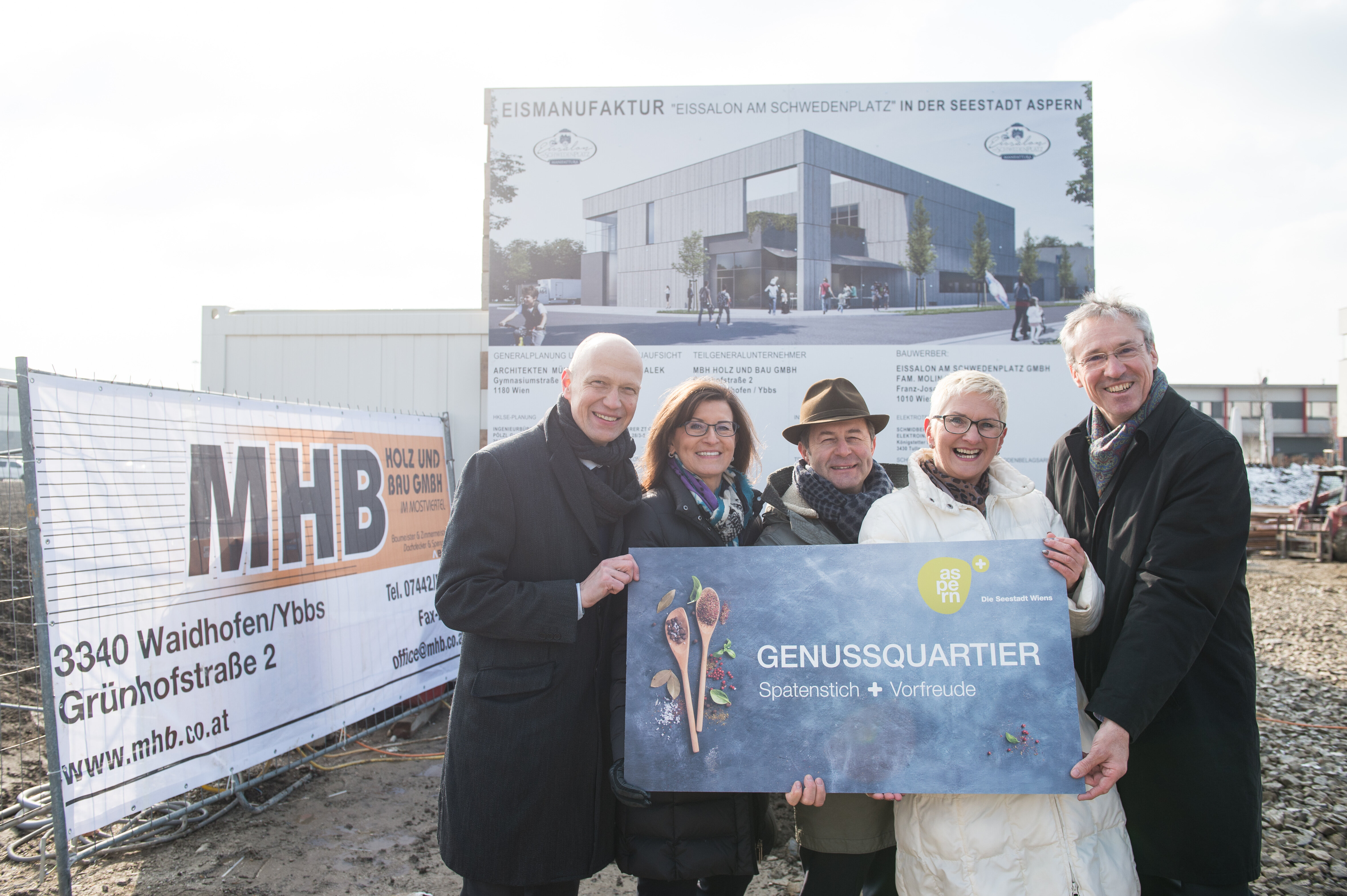 Am 14. Februar 2018 erfolgte der Spatenstich für das erste Unternehmen im neuen GENUSSQUARTIER aspern SEESTADT. Damit entsteht im Südteil der Seestadt ein Zentrum für innovative Lebensmittelproduzenten, die dort auch Einblicke in ihre Arbeit geben. Mit der traditionsreichen Eis-Manufaktur Molin-Pradel wurde ein erster Ankerbetrieb gefunden. Das weit über die Stadtgrenzen Wiens bekannte „Eis am Schwedenplatz“ wird ab 2019 auch in der Seestadt produziert, samt Schau-Manufaktur und Verkauf vor Ort.