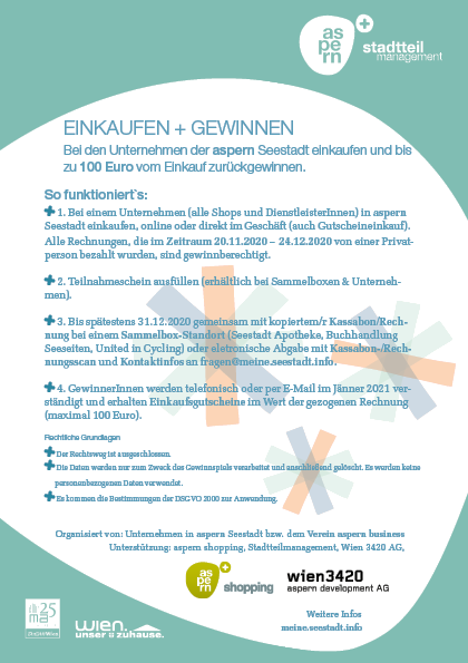 - Die Gewinner*innen werden in der ersten Jänner-Woche 2021 im Rahmen einer Ziehung ermittelt, die Übergabe der in der Seestadt gültigen Einkaufsgutscheine erfolgt ab 9. Jänner.