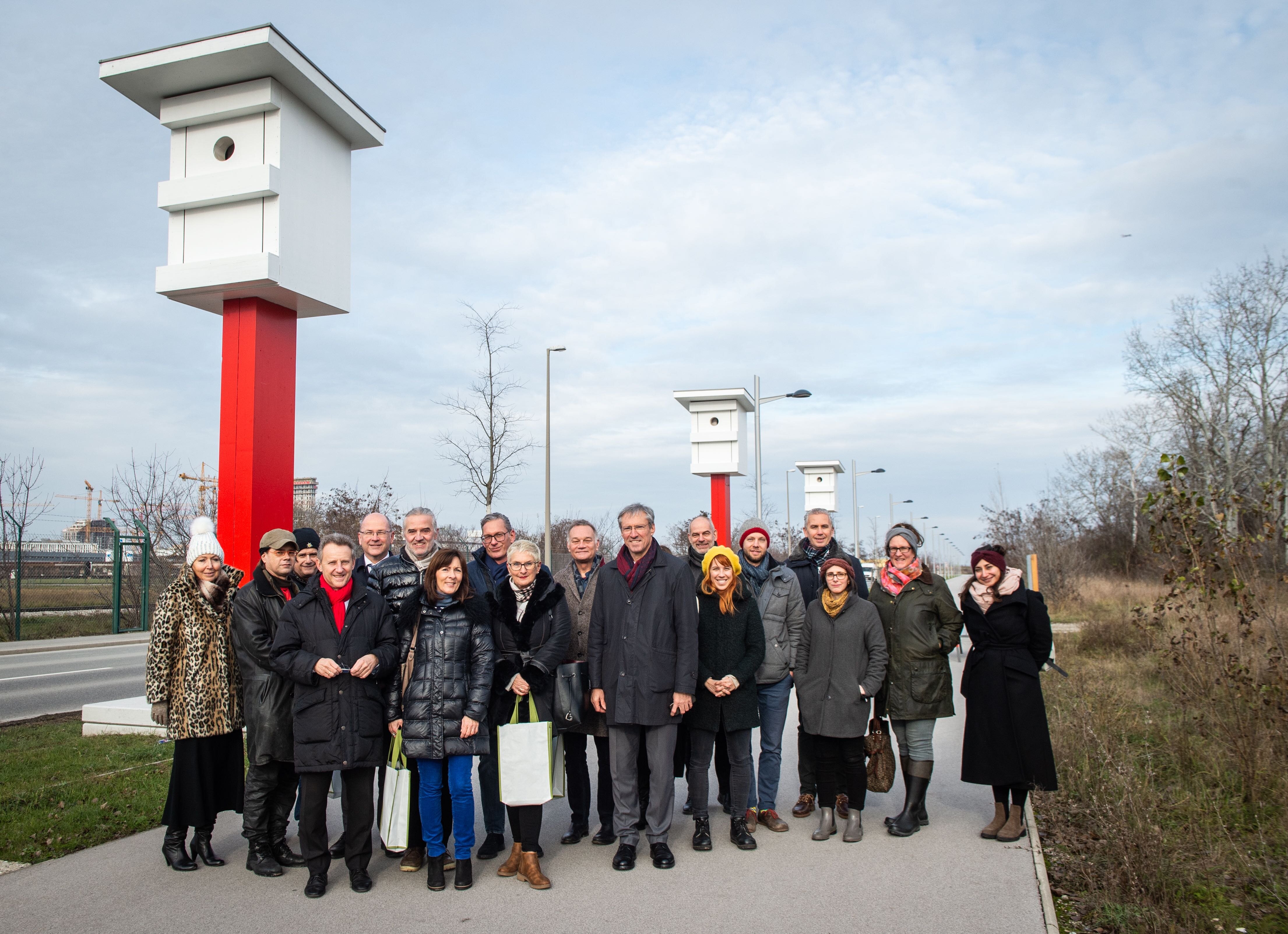 Die drei riesigen Nistkästen werden in aspern Die Seestadt Wiens bleiben. Im Rahmen einer Einweihungsfeier unter der Schirmherrschaft des Wiener Landtagspräsidenten Ernst Woller wurde eine Infotafel enthüllt, die Interessierten ab sofort die Hintergründe des Kunstwerks erklärt.